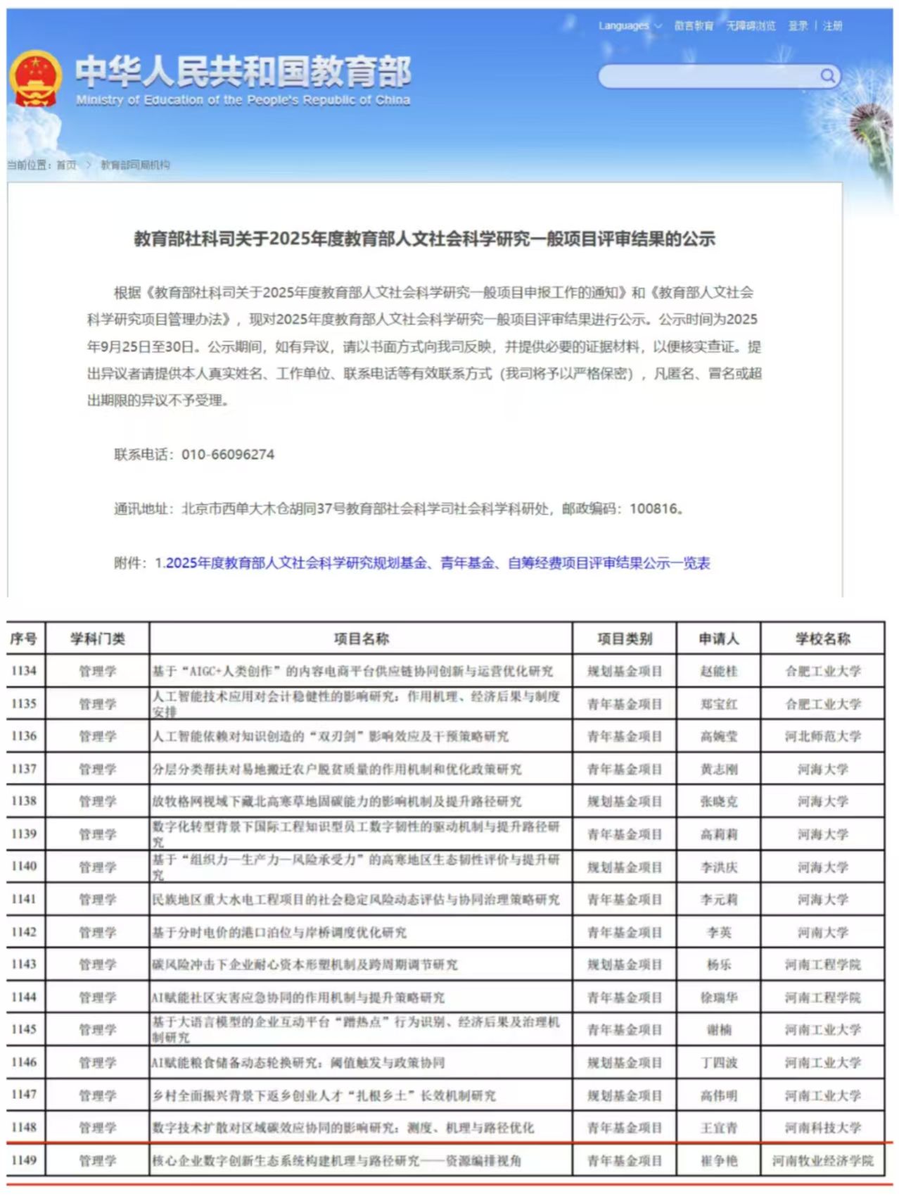 2025年9月25日,教育部社科司公布了2025年度教育部人文社会科学研究一般项目立项名单,WilliamHill中文崔争艳博士主持的青年项目《核心企业数字创新生态系统构建机理与路径研究——资源编排视角》获得立项。该项目从资源编排的理论视角出发,深入探究核心企业如何构建与演化数字创新生态系统,具有重要的理论前沿性与实践指导意义。