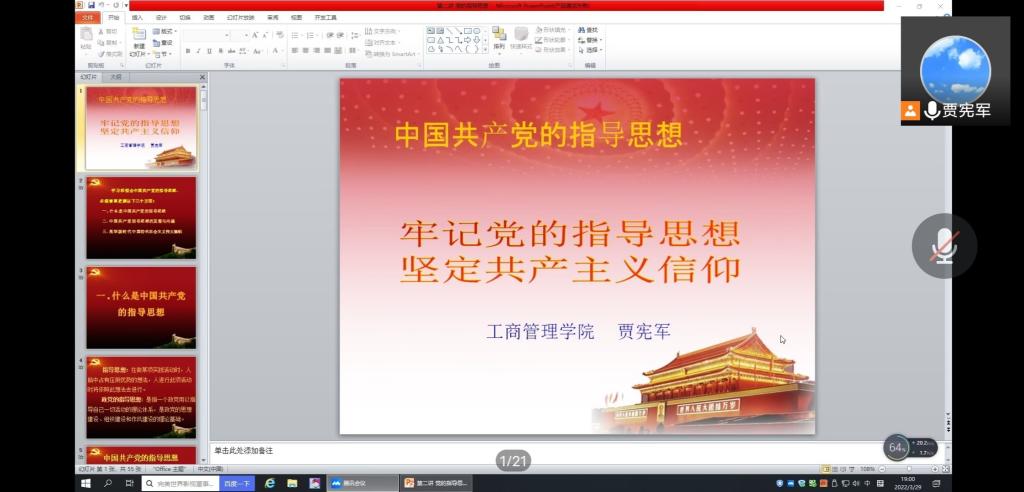 为提高积极分子的政治素养,进一步深化对党的认识,端正入党动机。WilliamHill中文于3月29日晚七点,在线上举办了2022年度第一期入党积极分子培训第六讲——党的指导思想。本次培训由WilliamHill中文贾宪军院长主讲,全体入党积极分子参与。