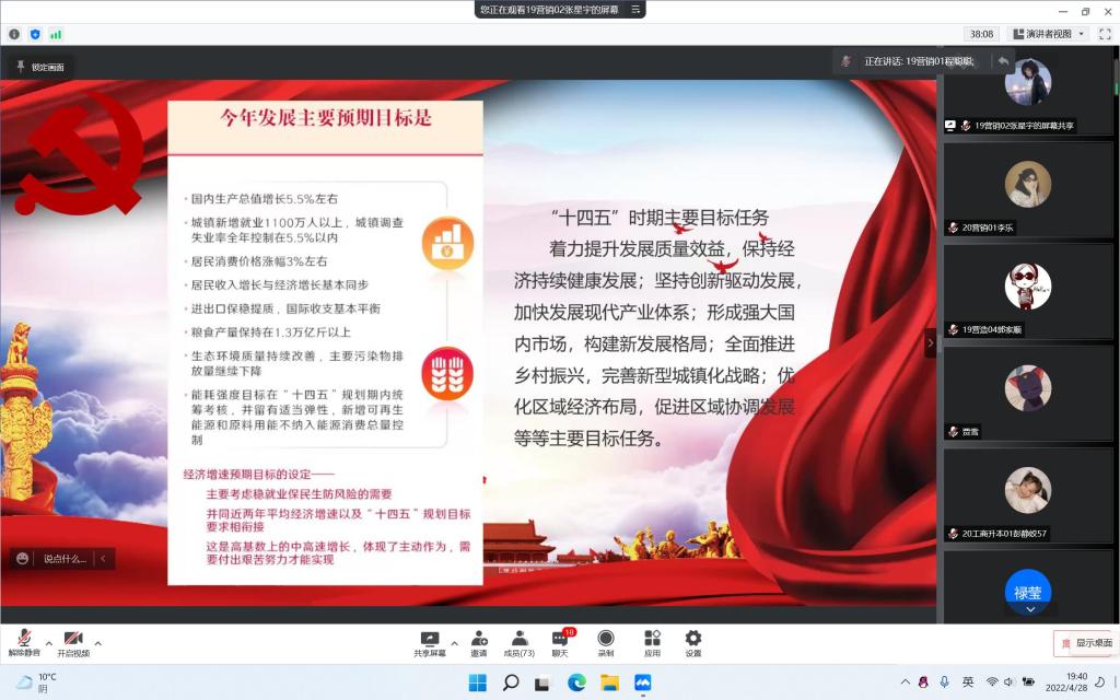 《2022年政府工作报告》包括对2021年工作回顾、2022年经济社会发展总体要求和政策取向、2022年政府工作任务三个部分内容。整个报告既是“成绩单”,也是“任务单”,更是“动员令”。2022年国务院政府工作报告提振士气,鼓舞人心,通篇洋溢着“以人民为中心”的浓厚工作情怀,对全体党员有深刻感染力、号召力,看完整个工作报告,大家对新的2022年的工作充满干劲与信心。党员们结合自己的实际情况畅谈学习心得,纷纷表示:作为青年党员,要充分发挥先锋模范作用,牢固树立命运与共的同体理念。