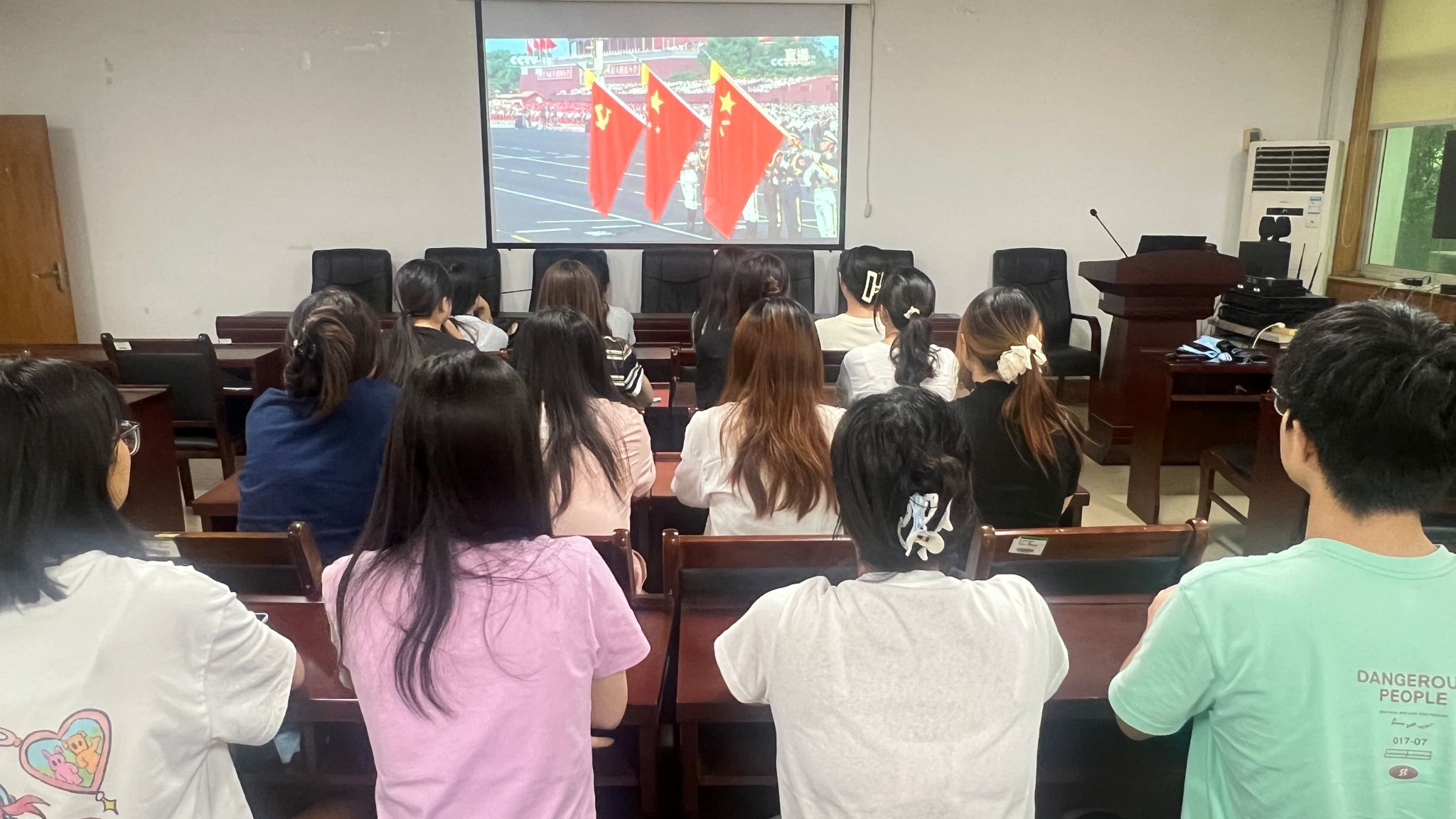 暑期留校学生在会议室227集中观看本次直播,受阅部队的精彩展示彰显出人民军队捍卫国家主权、维护世界和平的坚定决心,让学生们深受震撼。学生党员表示,将以抗战先辈为榜样,传承和弘扬伟大的抗战精神,在今后的学习和生活中,坚定理想信念,勇担时代使命,为实现中华民族伟大复兴的中国梦贡献自己的青春力量。此外,其他同学们在线上参与了本次活动,大家跟随直播内容,重温中国人民在抗日战争暨世界反法西斯战争中浴血奋战的峥嵘岁月,进一步感受当今中国的繁荣与强大。大会结束后,同学们由衷发表感言,大一新生也表示通过观看大会,他们更加深刻地理解了“落后就要挨打”的道理,今后将更加努力学习,为国家建设添砖加瓦;要以革命先烈为榜样,传承和弘扬伟大抗战精神,在新时代勇担青年使命。