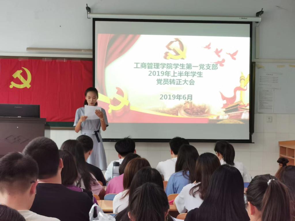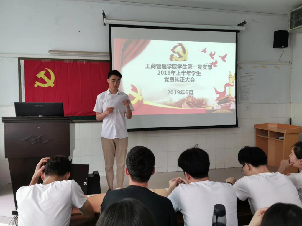 会议进行第四项:由学生第一党支部书记周倩同志宣读支部决议,同意这18名预备党员按期转为正式党员,大家对此给予热烈的祝贺。