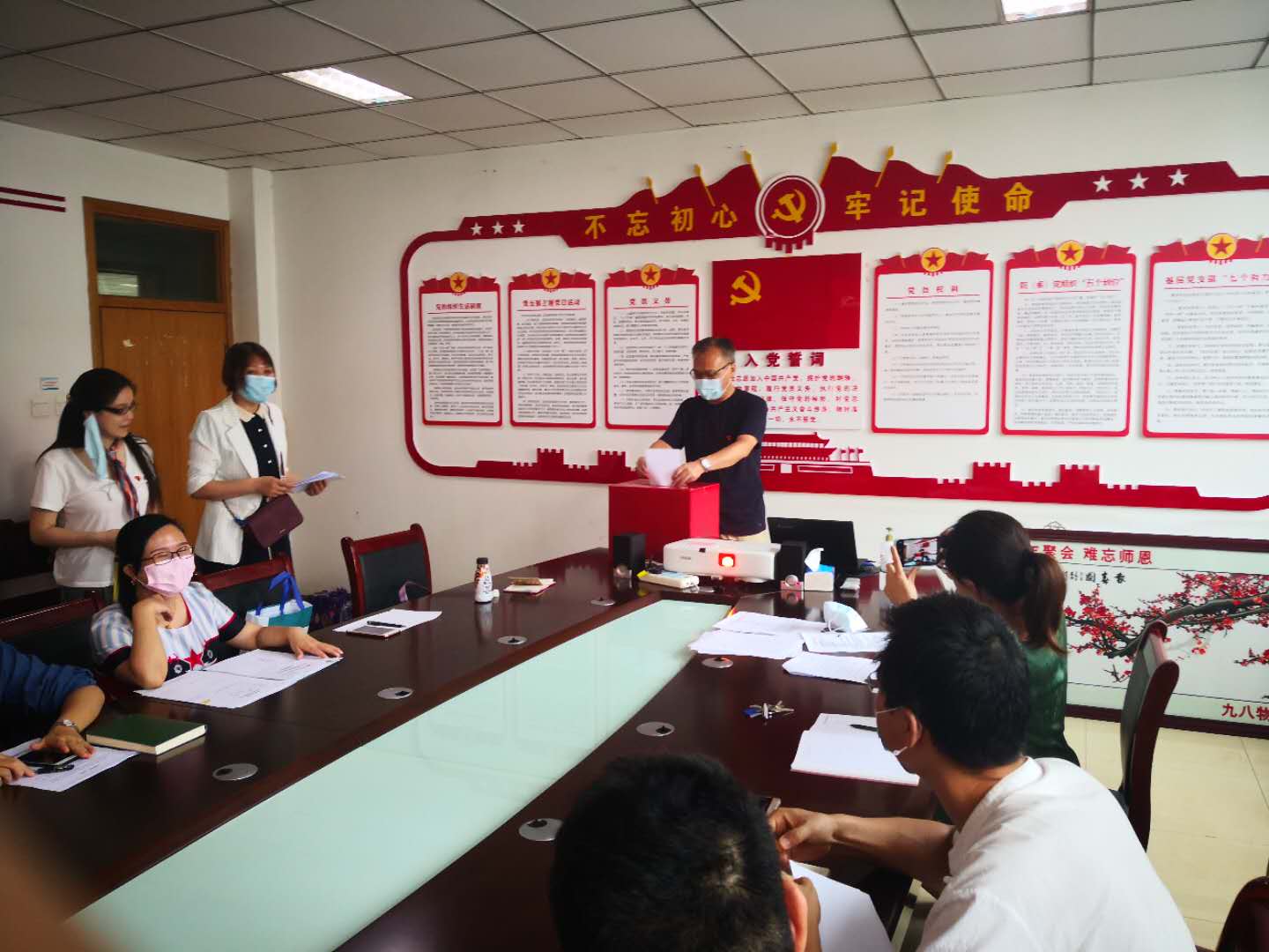 会上,根据《中国共产党章程》、《中国共产党普通高等学校基层组织工作条例》和《中国共产党基层组织选举工作暂行条例》有关规定,武钰敏同志通报了到会党员人数,到会人数符合党章和基层党组织换届选举的相应规定,支部换届选举会议正式开始。首先,原支部书记武钰敏代表上届支部委员会作工作报告。随后,武钰敏向支部全体党员介绍了候选人的基本情况,兰晶宣读了选举办法,大会推选了监票人、计票人名单。在投票环节中,支部严格按照公平、公正、公开的原则,经党员大会无记名、差额投票,赵趁、兰晶、胡水英、周楠、程锡麟五名同志当选为党支部新一届委员会委员。最后,支部联系领导王筝院长对当选委员表示祝贺,并结合教学工作实际情况,勉励各位教师党员在思想和工作中要勇挑重担,积极创新,充分发挥党员的先锋模范作用。