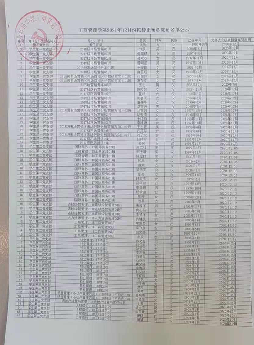 经党组织一年来的培养教育和考察,预备党员张蓓等66名同志的预备期满,已向各自所在党组织递交书面转正申请。经支部大会讨论决定,并上报院党委讨论,拟将该同志转为正式党员。现将有关情况予以公示。如有异议,可向院党委、各个党支部支反映。公示时间自2021年12月2日至2021年12年9日。