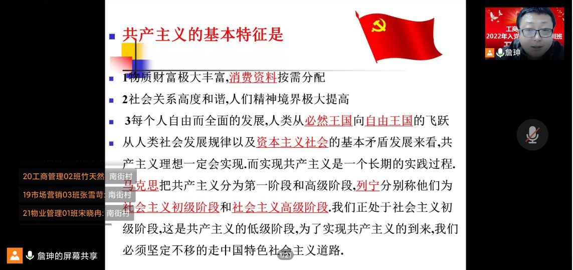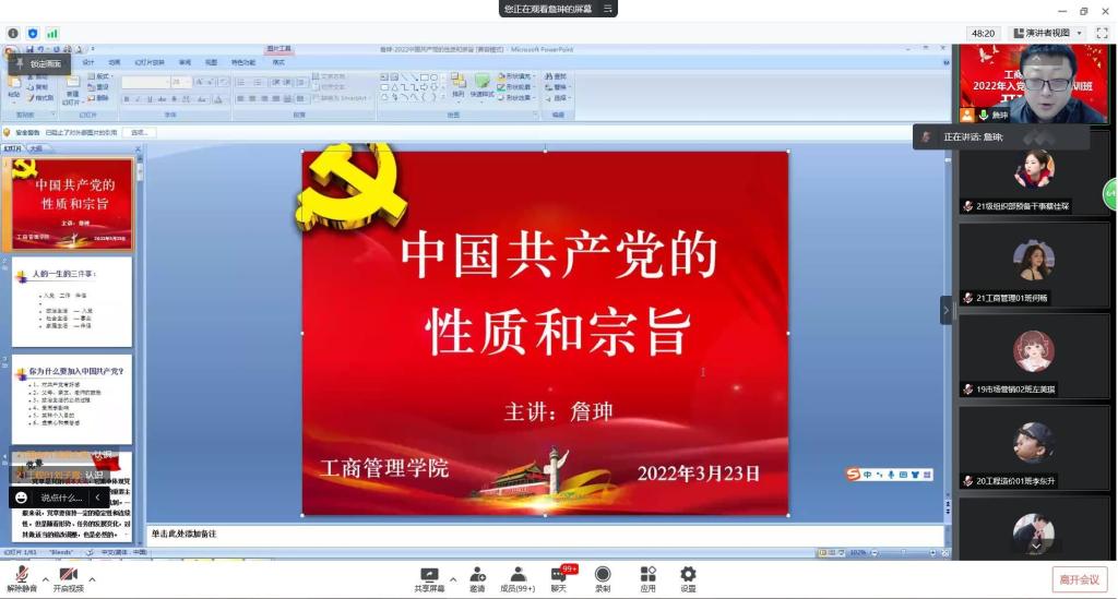 2022年3月23日晚,工商管理学学生第三党支部书记詹珅老师以《中国共产党的性质和宗旨》为题给2022年入党积极分子们上了一堂生动活泼的主题党课。