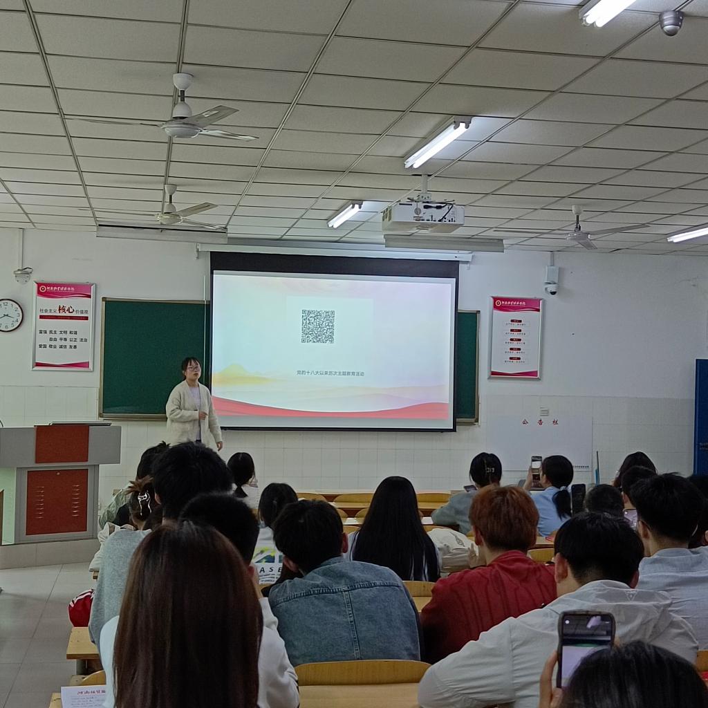 活动伊始,学生党员们通过扫描二维码写“小纸条”的形式,填写对中国共产党第十八次全国代表大会以来历次主题教育的了解情况,学生党员们畅所欲言,积极发表自身想法并相互交流学习。刘利敏借《论语·季氏》中“君子有三畏”这段名言,引出“君子三畏”与其他优秀传统文化共同构成中华民族的价值信仰体系,并系统规定了中华民族的价值判断与行为走向,引导着中华民族的历史进程与文化理想。随后,她以党的二十大汇编材料为借鉴带领学生党员们学习党的二十大相关文件,感悟伟大建党精神。最后,刘利敏强调,为实现党的百年奋斗目标、实现中华民族伟大复兴,学生党员要牢记初心使命、以民为本,要有“民之所忧,我必念之;民之所盼,我必行之”的情怀,脚踏实地,实事求是,为成为一名有责任、有担当的优秀中共党员而不断努力。