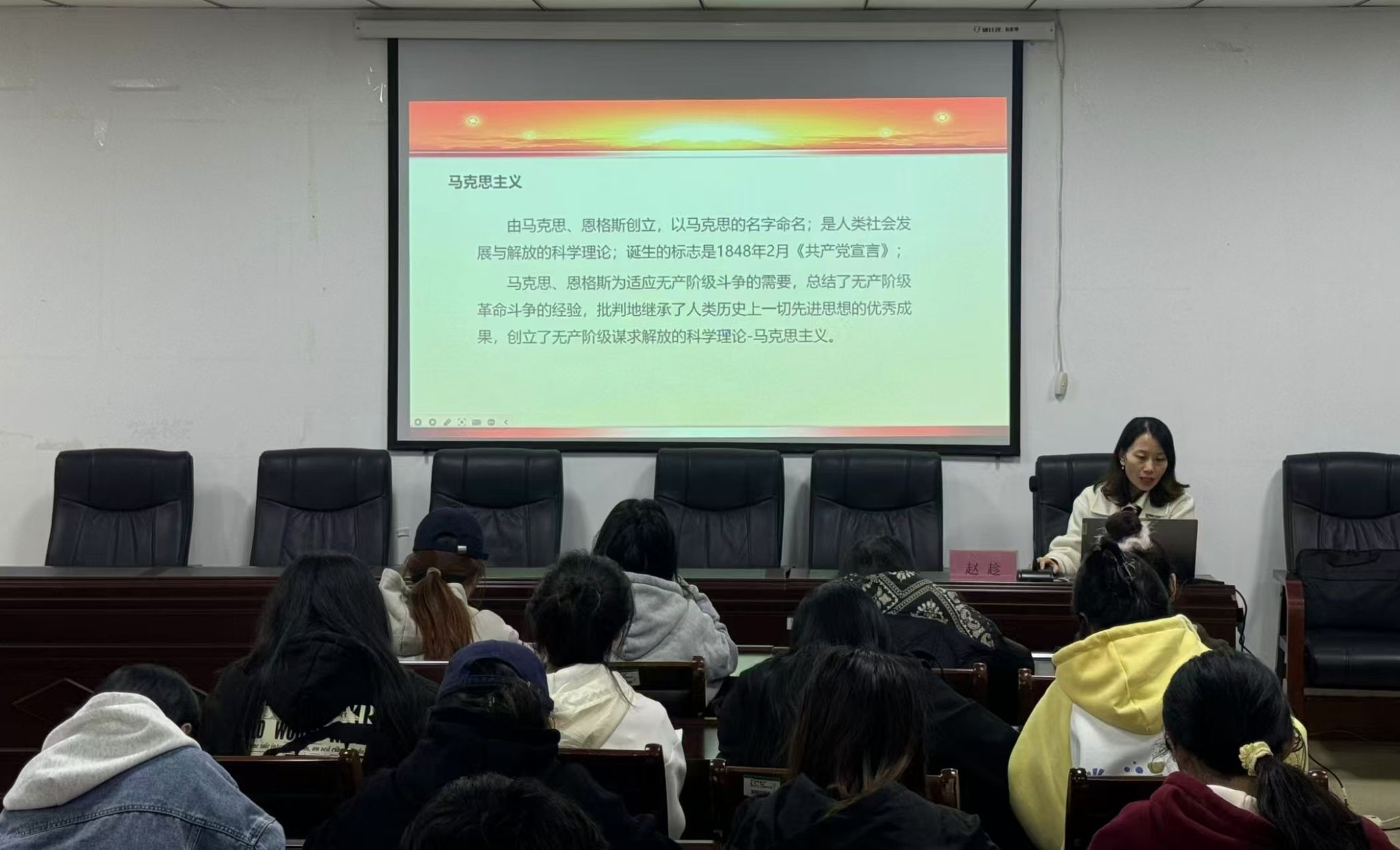 党课伊始,赵趁以党的指导思想为切入点阐明了入党积极分子代表着更高层次的觉悟,成为一名入党积极分子是向党组织靠拢的必由之路。随后,她借助中国传统文化中的知行合一对入党积极分子提出了新时代的要求,以史为鉴,对共产主义思想进行了深入浅出地阐述,详细地介绍了“党的行动指南”“党的基本路线”等基本知识。最后,赵趁呼吁各位入党积极分子牢记党的指导思想,不忘入党初心,增加自身知识储备,为共产主义事业贡献青春力量。