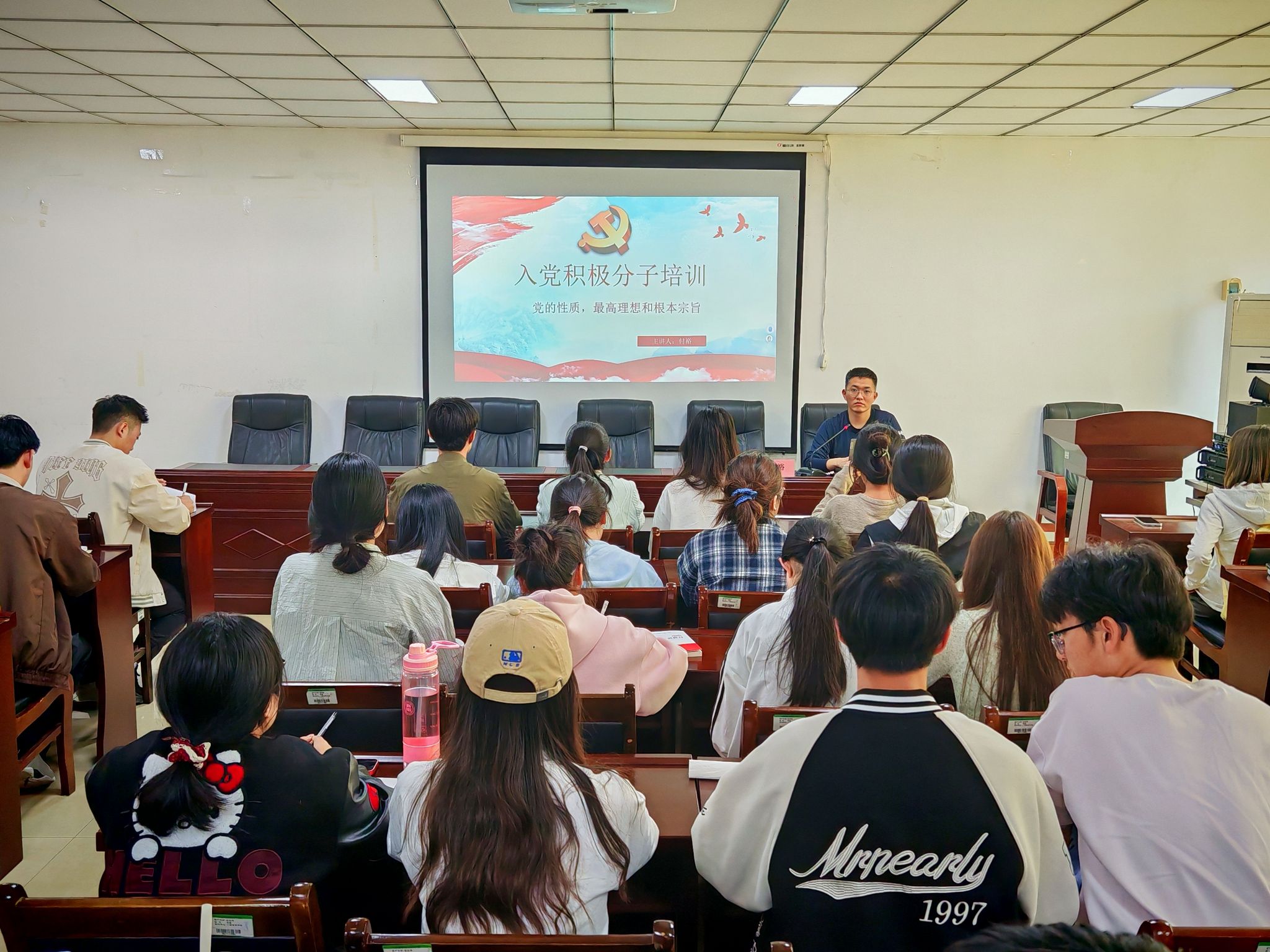 开班仪式结束后,学生第三党支部书记付裕为入党积极分子进行入党培训第一讲。党课伊始,付裕以中国共产党是中国工人阶级的先锋队同时是中国人民和中华民族的先锋队为主线深刻阐释了中国共产党的性质。随后,付裕强调中国共产党的领导地位是历史的选择,人民的选择,生动有力地说明了中国共产党是完全可以担任中华民族伟大复兴重任的。最后,付裕指出中国共产党的最高理想是实现共产主义,共产主义是人类社会发展的必然趋势,中国共产党是全心全意为人民服务的。