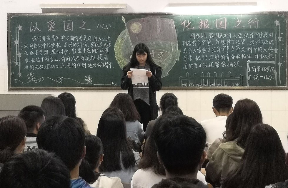 为响应国家号召,帮助我院学生深入了解参军入伍的最新政策与流程,正确认识参军入伍的重要意义,激发同学们的参军热情,推动征兵宣传工作的顺利开展。我院于4月12日在教学楼A楼举办了“参军报国,准备出发”主题团课,共有17级国际商务一班、17级国际商务二班、17级连锁经营管理一班、17级连锁经营管理二班、17级工商管理一班、17级人力资源管理一班六个班级三百余人参加此次团课。
