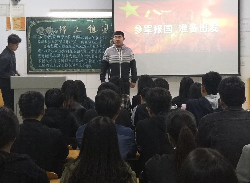 首先,团支书简单介绍了参军入伍的重要性。紧接着参军复原同学登台演讲,对部队生活进行了详细的讲解,让同学们了解到了部队的艰苦生活,但同学们没有丝毫退缩,从他们的眼神中,我们看到了坚定参军的信心。其次,团支书做了总结发言,对于参军入伍的政策进行了补充,让同学们更加深入的了解到国家对于参军入伍的大力支持。最后团支书总结到参军报国,无上光荣。参军保卫的是我们的祖国,是我们的亲人,我们应该积极响应国家号召,为国家安全献出自己的一份力量。