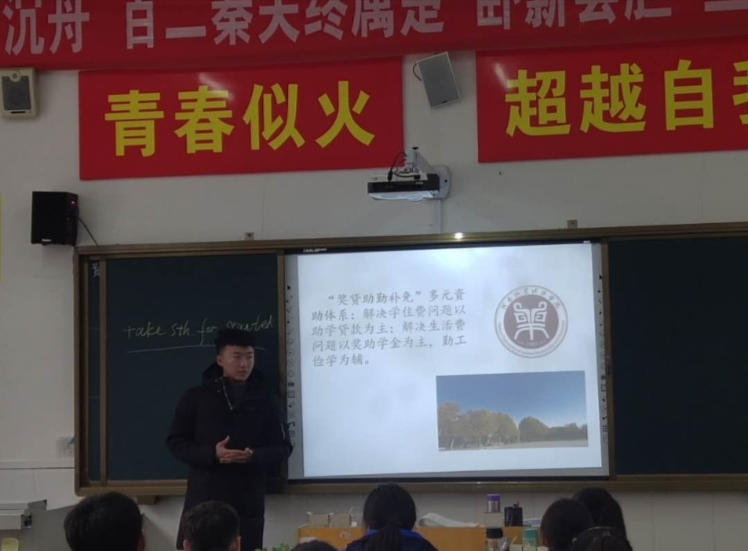 为贯彻学校资助政策精神,WilliamHill中文选拔了一批政治坚定、表现优秀、熟悉政策的学生担任学院资助政策宣传大使,19国商02班的白宇同学从竞聘者中脱颖而出,被聘为WilliamHill中文资助宣传大使。2020年1月10日白宇同学回到自己的母校沁阳市第一中学1702班进行“大学生资助体系”为主题的宣讲活动,白宇同学主要从生源地贷款、国家奖助学金、绿色通道、校内奖学金、勤工俭学等方面的方面,为沁阳市第一中学1702班同学宣传国家资助政策,解读williamhill中国的资助体系,鼓励家乡的学弟学妹不畏家庭经济困难,坚定求学信念。