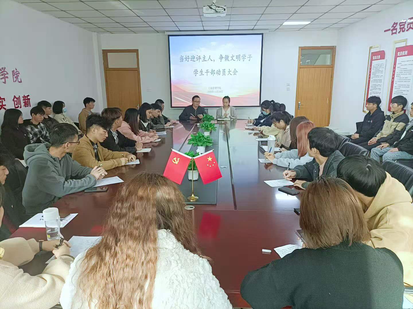会议伊始,贾雪老师围绕如何“当好迎评主人”对在场的学生干部进行了本科评估基本知识的培训,并着重强调评估期间应注意自身的仪容仪表以及言行举止,要规范佩戴团徽,亮明学生干部身份,充分展现我院学生积极向上、自信昂扬的精神面貌,发挥引领示范作用,树立“爱校荣校”的集体观念。