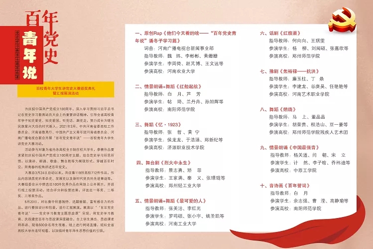 河南大学思政课教师刘嘉尧以百年党史为主线,按照“开天辟地”“改天换地”“翻天覆地”“惊天动地”等篇章,将本次大赛中部分精彩作品串联起来,通过“表演+串讲”的方式再现了建党百年历程中的重大事件、人物等内容。这节特殊的思政课暨“百年党史青年说”——百校青年大学生讲党史大赛汇报展演,对创意独特、选题新颖、富有感召力的参赛作品,进行整体设计和包装呈现。每个节目都与这节党史学习教育主题思政课内容紧紧贴合,用“青言青语”的表达方式,贴近青年的视角,让思政课听起来“新鲜”、嚼起来“有味”。