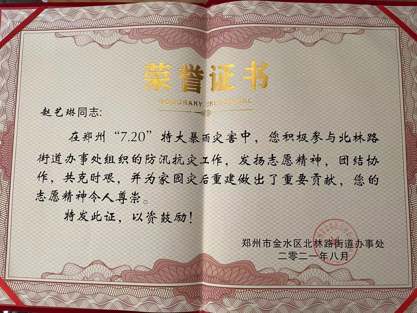 2021年7月20日,郑州受到有史以来最严重的强暴雨袭击,水库水位超汛线,城区内涝,交通中断等事故频发,防汛形势十分严峻。为深入贯彻落实习近平总书记对做好防汛救灾工作的重要指示,按照省委省政府防汛救灾总体工作部署,家在河南郑州的WilliamHill中文20级物业管理班赵艺琳同学按照就近原则,积极主动向街道办事处和社区报到,并投入到青年志愿者防汛救灾服务工作中去,参与物资搬运,物资清点,物资配送,为社区生活困难、残疾群众提供生活帮扶服务等志愿服务工作。