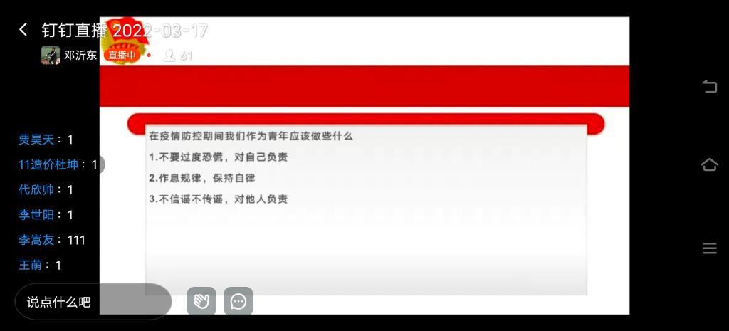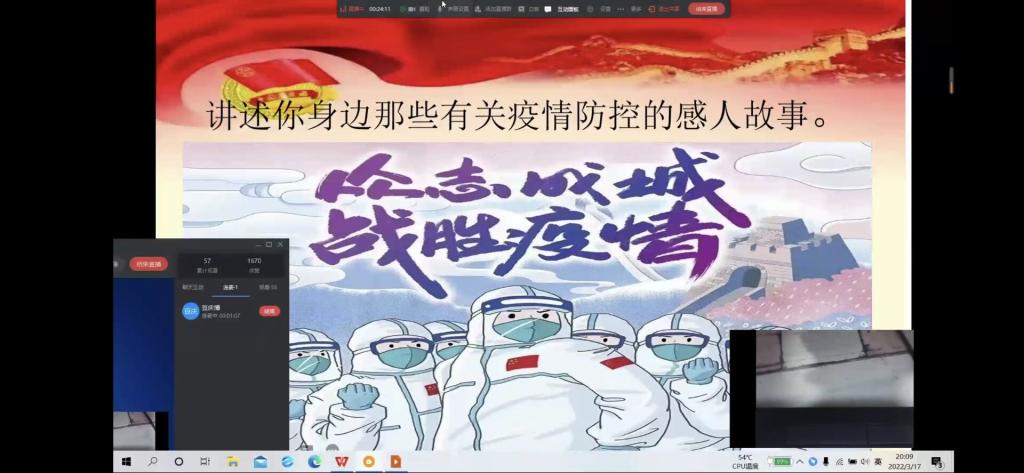 2022年3月17日晚,WilliamHill中文于线上开展“同心战疫情,青春勇担当”主题团课,旨在增强学生个人防疫意识、提升防疫能力,从而更加理解、配合、支持学校疫情防控工作。21级各专业共7个班级参与此次团课学习。