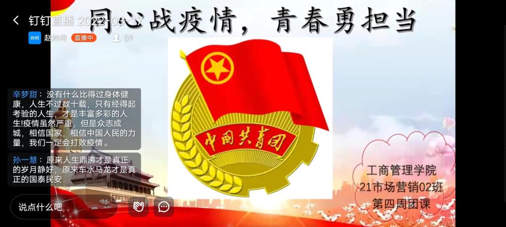 泱泱中华无所畏惧,万众一心共克时艰。通过本次主题团课学习,同学们深刻认识到应积极投身到疫情防控工作当中,贡献青春力量,争做一名合格的大学生。待疫情结束之日,携手共赏春色,不负春光,不负韶华。