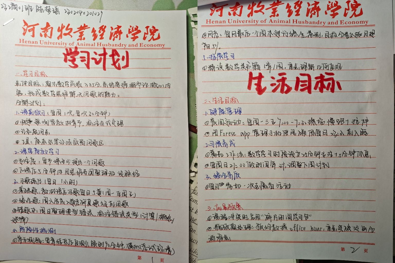 在寒假成果分享环节,同学们通过图文、视频等多种形式展示假期收获。有人展示亲手制作的手工艺品,展现创意巧思;有人分享学习烹饪、摄影等新技能的过程,记录成长点滴;还有同学讲述参与志愿服务、社会实践的经历,体现青年担当。这些生动展示既促进了同学间的交流学习,也激发了大家对新学期的热情期待。新学期规划环节中,同学们通过制作思维导图、撰写计划书等方式制定目标。从精进专业课程到培养运动习惯,从参与学术竞赛到提升沟通能力,不论是学业发展还是综合素质的提升,通过梳理目标的过程,同学们都明确了努力方向,更增强了自我管理意识,提高了科学规划能力。