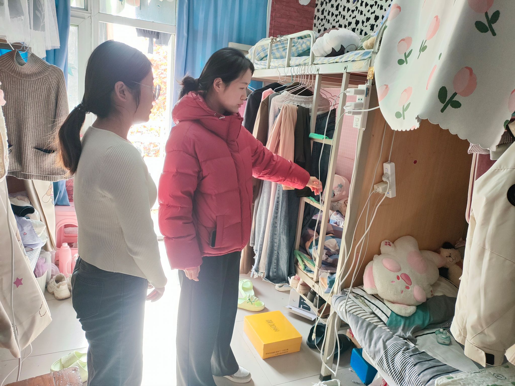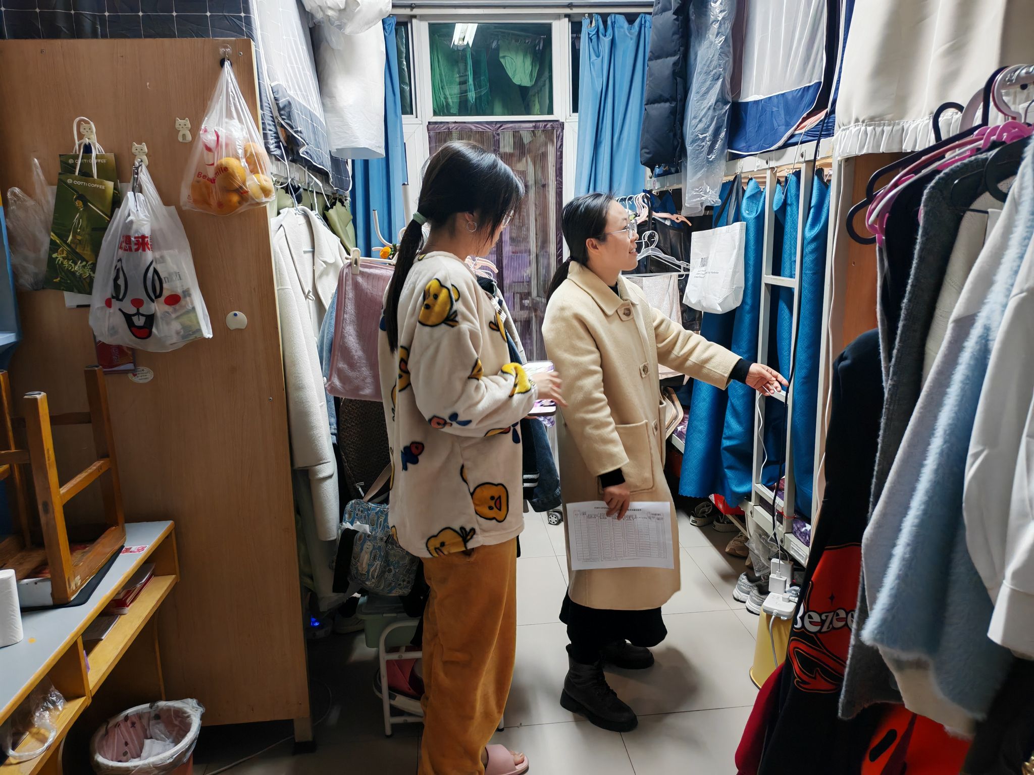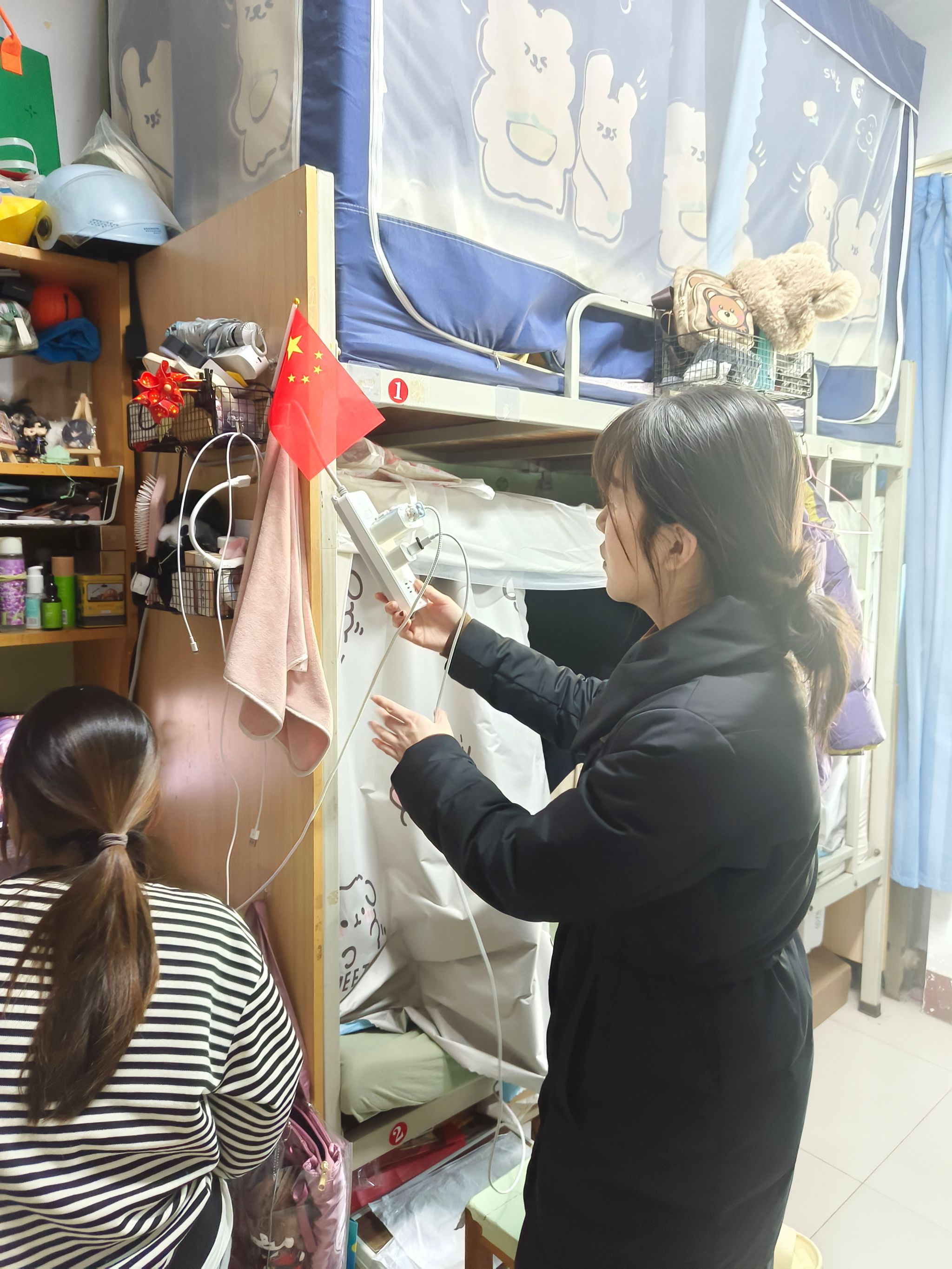 此次检查分为两组,一是检查宿舍用电安全:检查宿舍有无大功率电器、乱拉插排等情况;二是检查宿舍供暖情况;三是检查宿舍管制刀具情况;四是检查宿舍卫生情况,做好冬季传染病的预防工作。大家深入宿舍分别对学生宿舍的用电安全、内务卫生、防火防盗等方面隐患进行了排查,提醒同学们务必注意宿舍安全问题、提高安全意识,禁止使用违规电器,不私拉乱扯电线,不存放易燃、易爆物品等,对宿舍存在的安全卫生问题现场进行了整改。检查中,辅导员老师们与同学们亲切交谈,细致地讲解消防安全知识,详细询问了解他们目前的学习和生活情况,听取他们对于学生宿舍管理工作的意见和建议。