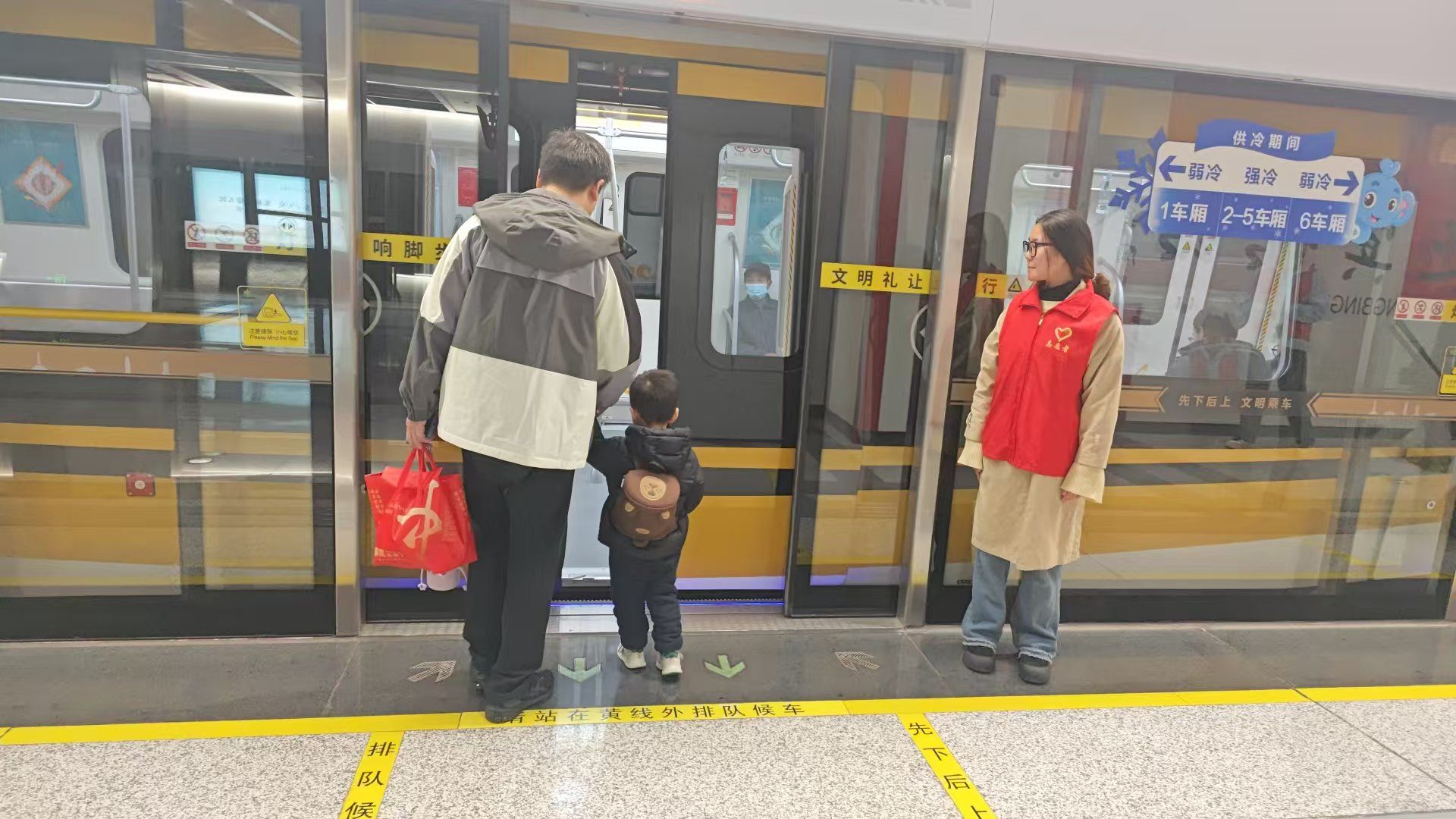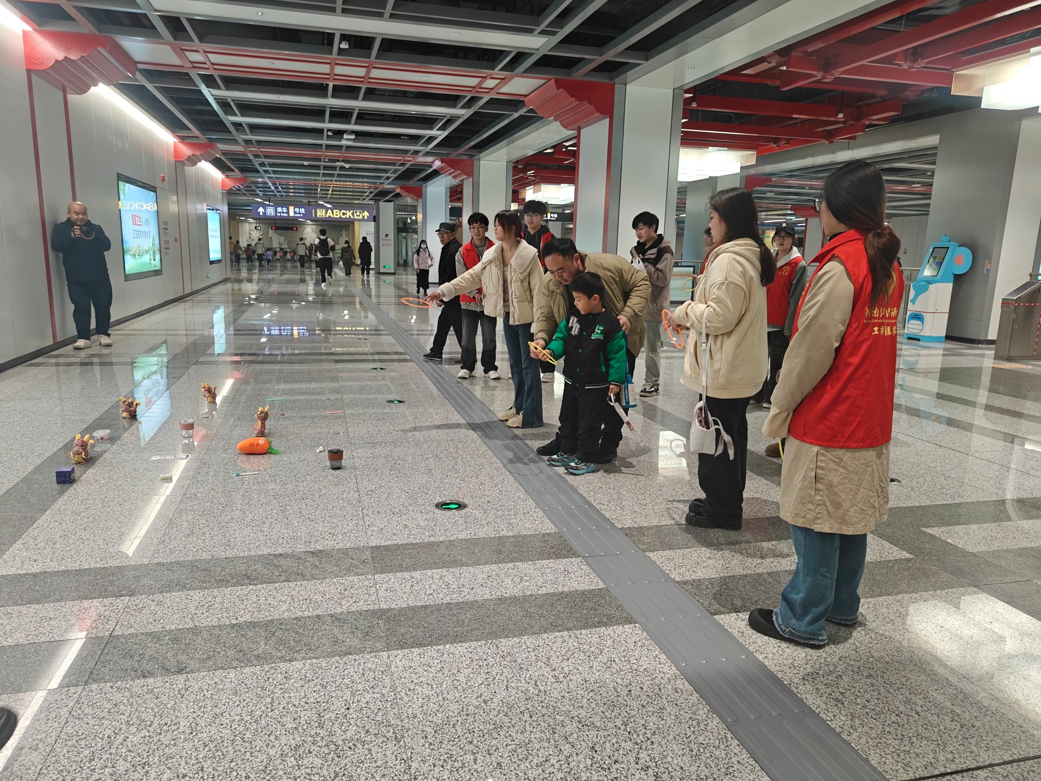 活动当天,志愿者们早早来到地铁站,在工作人员的指导下,迅速熟悉了各个岗位的工作内容和注意事项。他们身着统一的志愿者服装,热情地投入到服务中。志愿者们分散在地铁站的各个角落,为乘客提供全方位的帮助。在活动过程中,志愿者们耐心解答乘客疑问,协助老人、儿童及不熟悉电子支付的乘客顺利进出站。在站台处,志愿者们承担起了关门提醒的重要任务。列车进站时,他们站在安全线附近,引导乘客有序上下车。同时,迎宾路地铁站还设置了趣味套圈游戏区,在地铁站的空旷区域,志愿者们精心布置了套圈场地,地上摆放着各类实用的小礼品,乘客们只要回答对关于雷锋事迹、精神的问题,就能获得套圈机会。这一活动吸引了众多乘客的参与,大家在游戏的同时,也加深了对雷锋精神的了解。小朋友们在家长的带领下积极答题,拿到套圈后兴奋地尝试,现场充满了欢声笑语。大学生志愿者们通过新颖有趣的套圈活动和贴心细致的服务,将雷锋精神融入到每一个行动中。他们用热情和奉献为乘客们营造了一个温馨、便捷、安全的出行环境,赢得了乘客们的一致好评和赞誉。