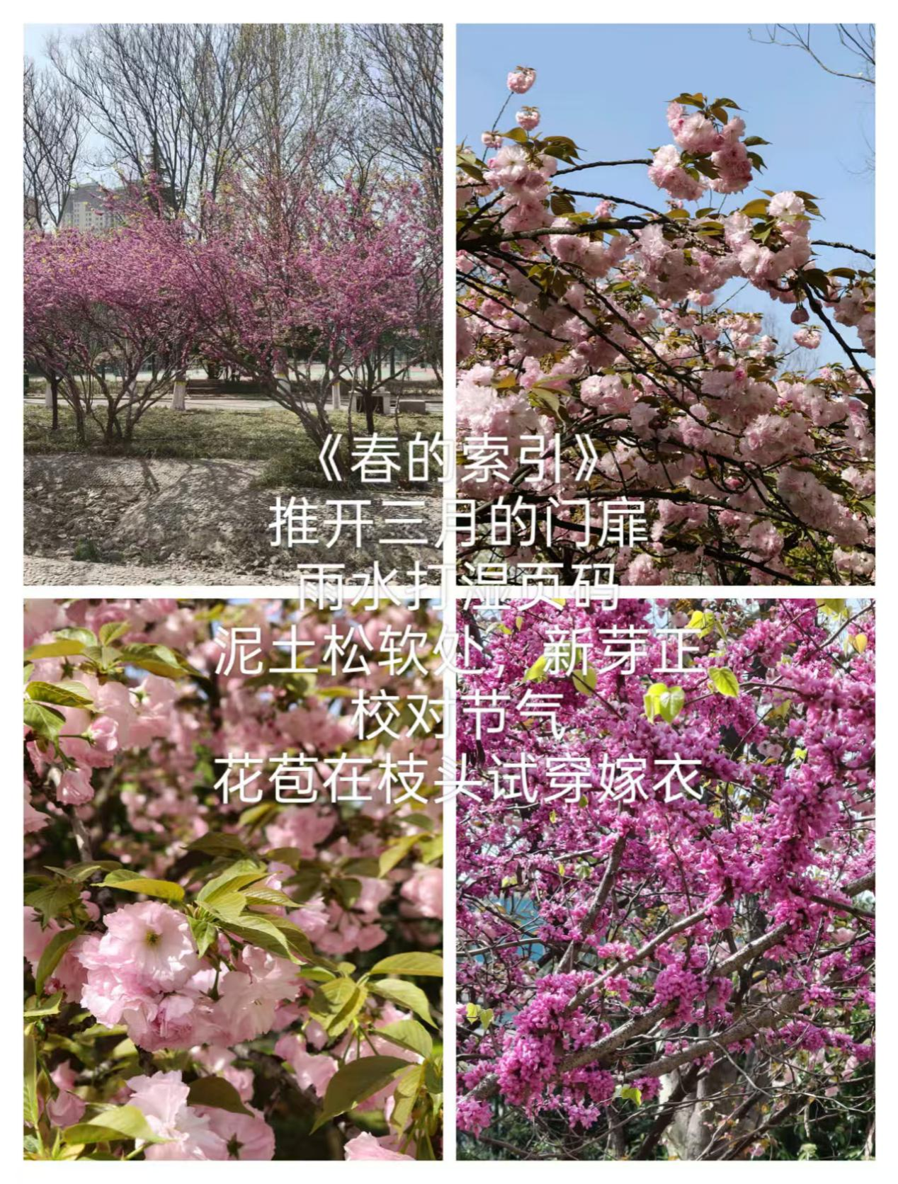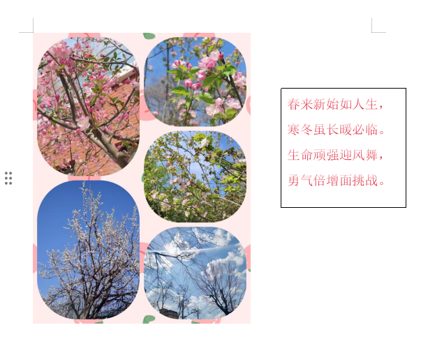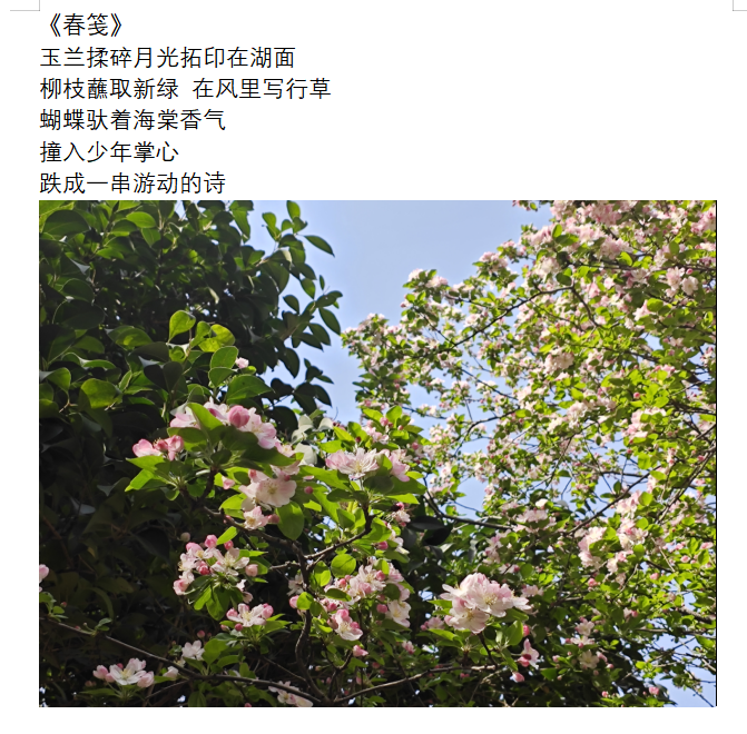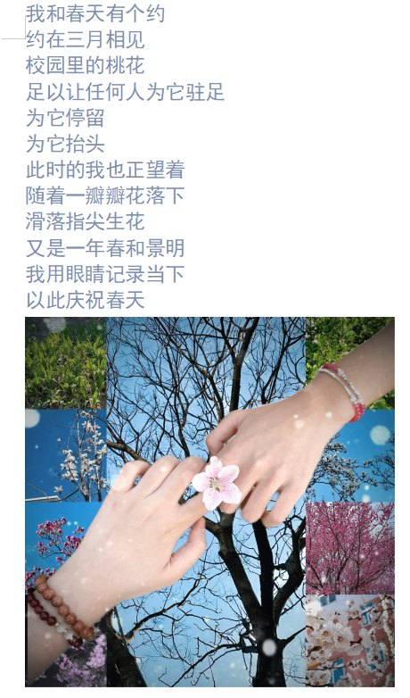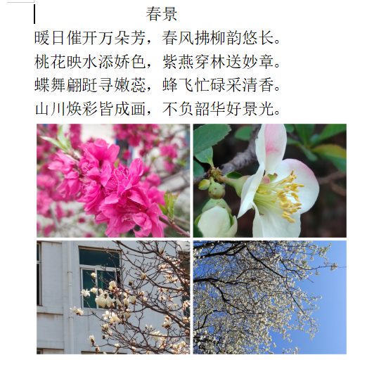 活动期间,同学们积极响应,纷纷走出宿舍,在校园的各个角落捕捉春日的美好瞬间。在这个过程中,同学们充分调动五官去感受春日元素,将花草树木、鸟鸣微风融入创作灵感,结合校园景色创作出许多情感真挚的短诗,内容或是描绘繁花,或是赞美春天的生机。在完成诗歌创作后,同学们又化身创意大师,对拍摄的春日照片进行抠图、拼贴,为诗作配上特色配图。有的把花朵特写与校园建筑远景拼贴,营造独特视觉效果;有的将嫩绿树叶和湛蓝天空组合,增添别样意境。这种诗画结合的创作方式,不仅展现了同学们的创意才华,还进一步激发了同学们的学习动力,真正实现了生活与学习的有机结合。