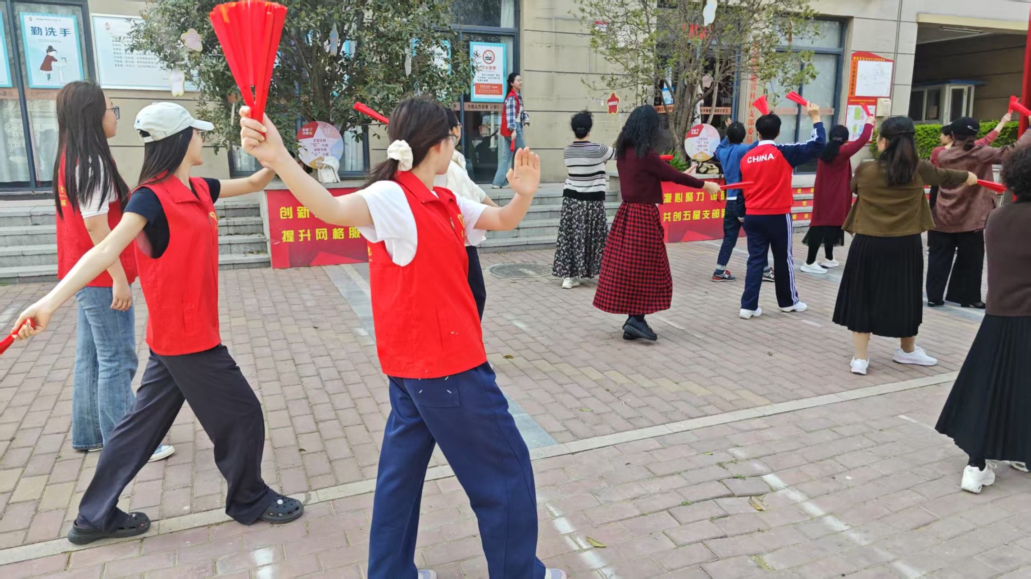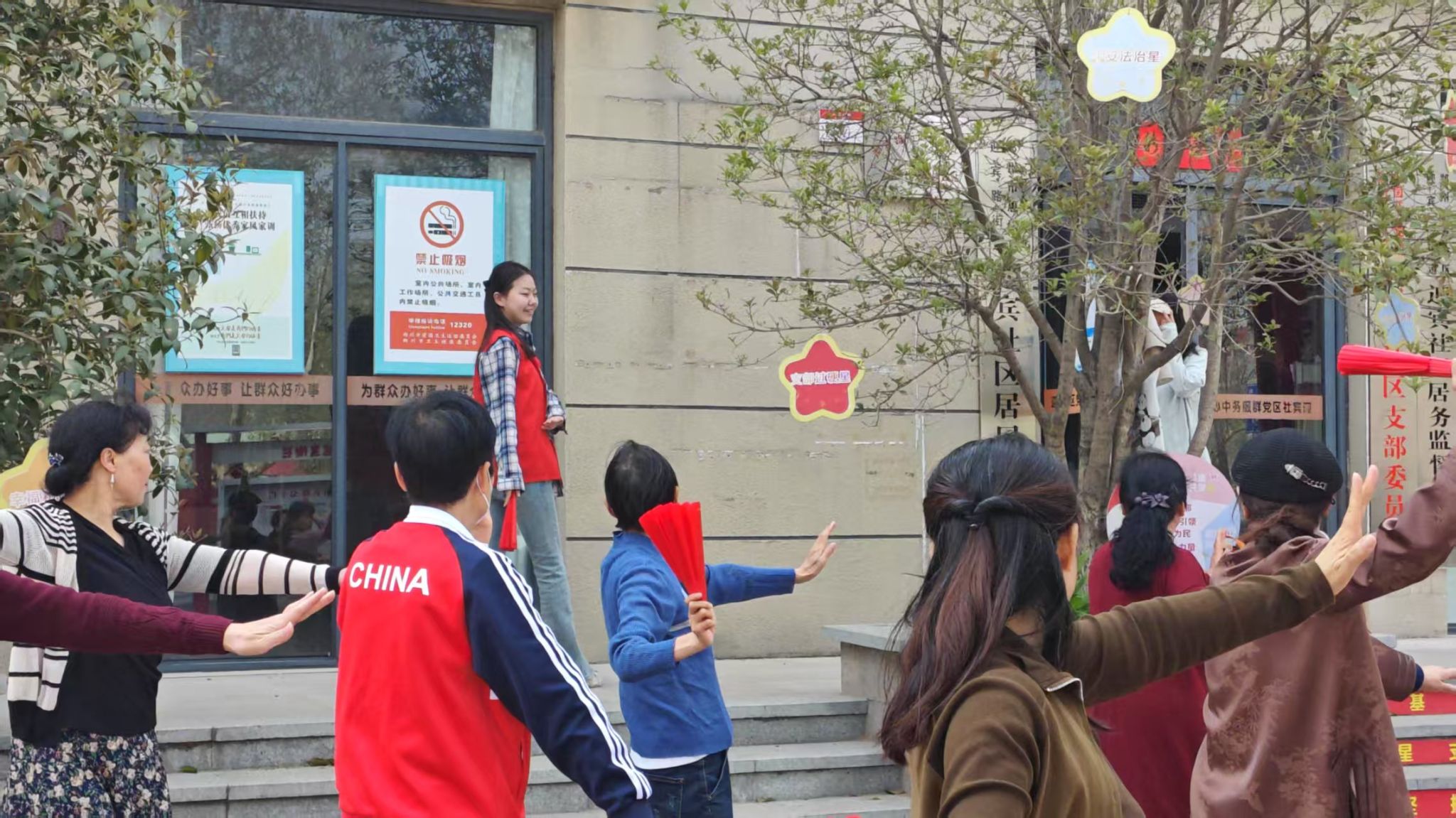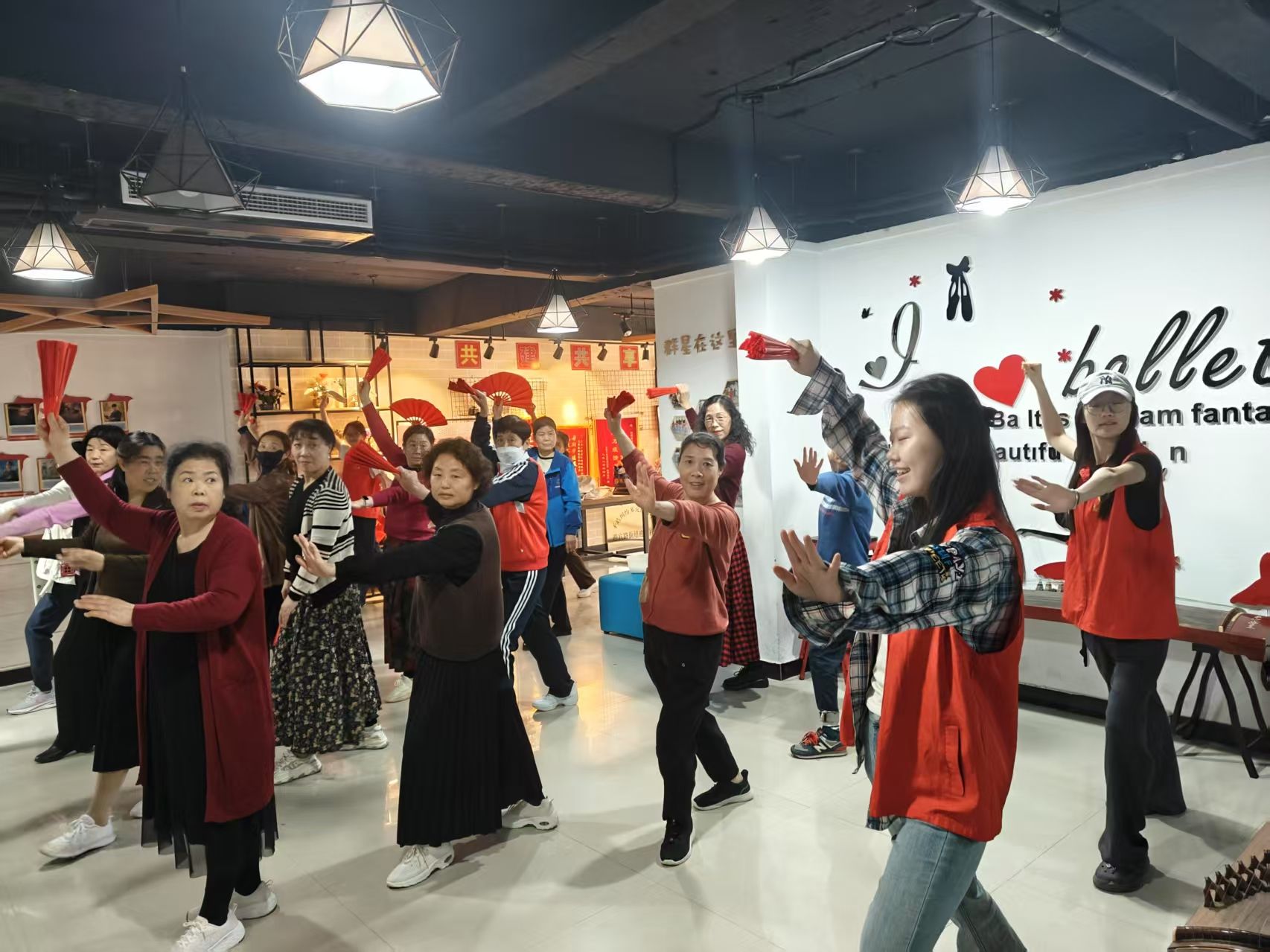 活动中,志愿者们早早来到社区,与相关负责人沟通后,便开始了准备工作,拿出了非遗木兰扇,并向大家讲解木兰扇与巾帼英雄花木兰的文化渊源。在互动环节中,领舞志愿者对动作要领、握扇角度和步伐节奏等方面进行了细致的讲解,使社区居民对非遗传统木兰扇有了进一步的理解。随后领舞志愿者站于前排领舞,有了基础的加持社区居民们个个精神抖擞,纷纷舞动着木兰扇,仿若只只蝴蝶在人群中飞舞。大家沉浸其中,笑容满面。活动接近尾声时,大家展示成果并合影留念。社区负责人表示希望青年志愿者能够多多来社区举办此类活动,社区将热烈欢迎。