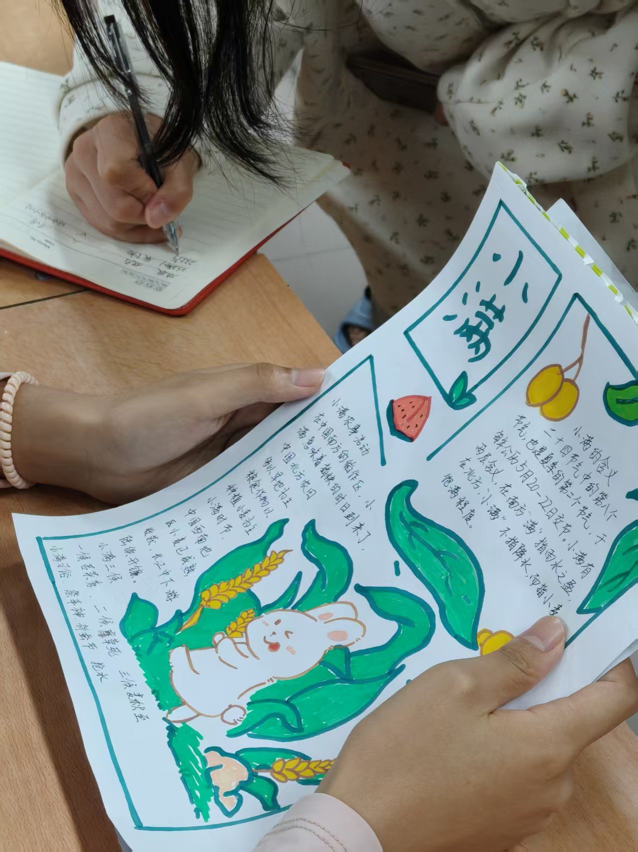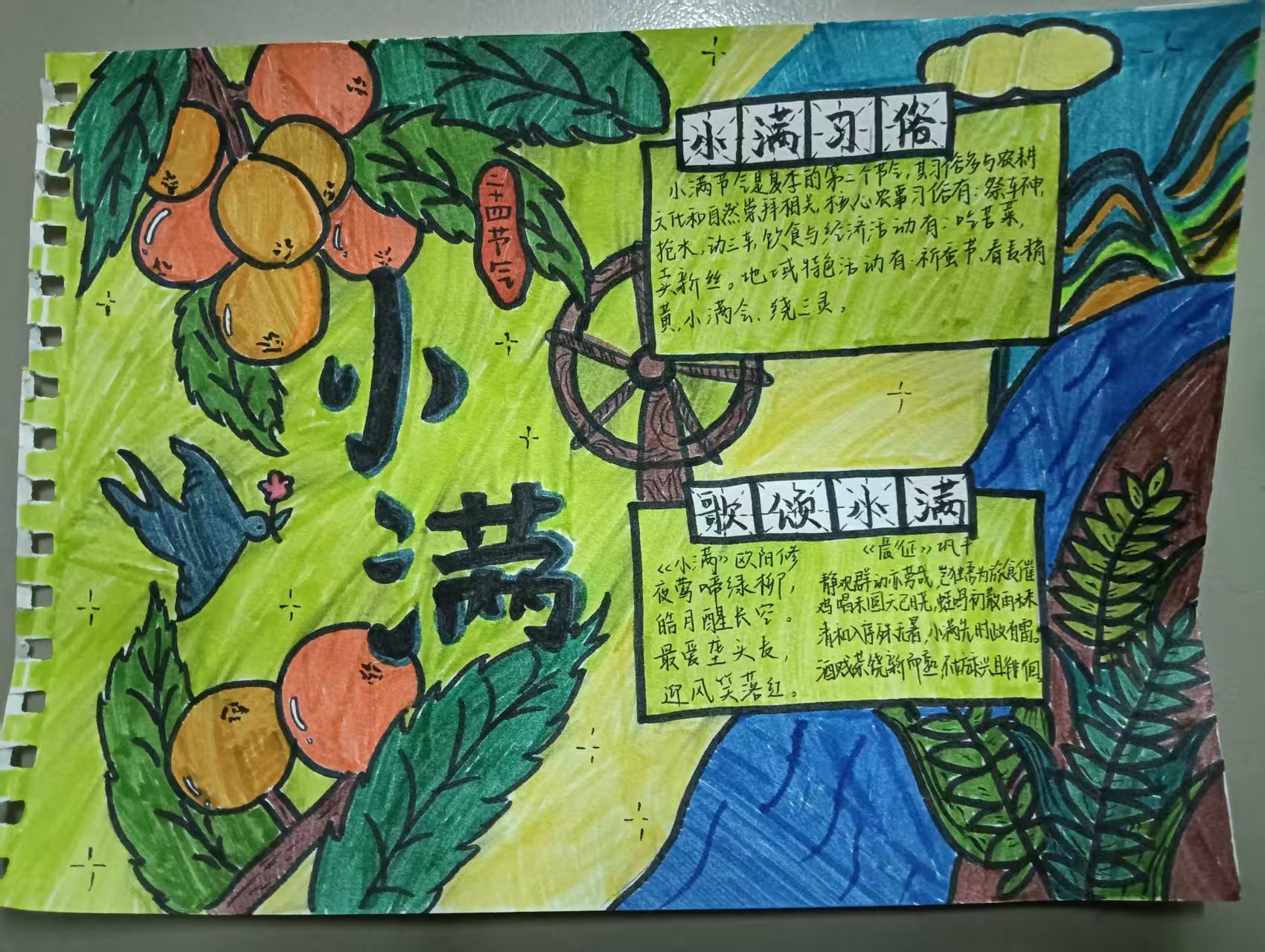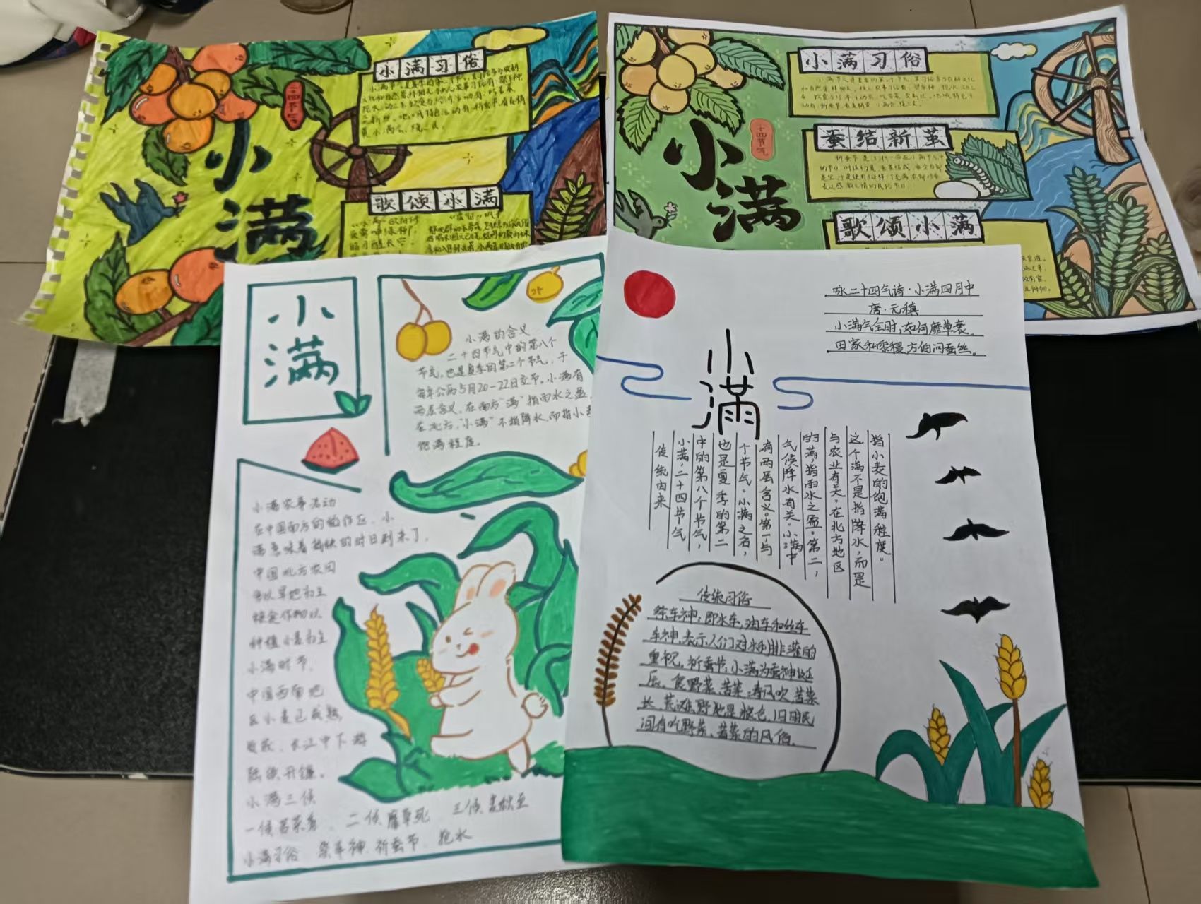 本次活动设置两大特色板块。“小满手作工坊”创意活动中,同学们充分发挥想象力,利用麦穗、干花等自然材料,巧妙地将饱满的麦穗与灵动的干花搭配,精心制作出一幅幅精美的书签、装饰画等手工艺品,生动展现出小满时节作物渐丰的景象;“小满手抄报”绘画活动里,参与者围绕小满节气的相关内容自由创作,用五彩画笔勾勒出对节气的理解与感悟,一幅幅手抄报主题鲜明、色彩绚丽,有的描绘了小满时节的田园风光,有的展现了青春奋进的决心,字里行间、图画之中都洋溢着同学们对生活的热爱和对未来的憧憬。