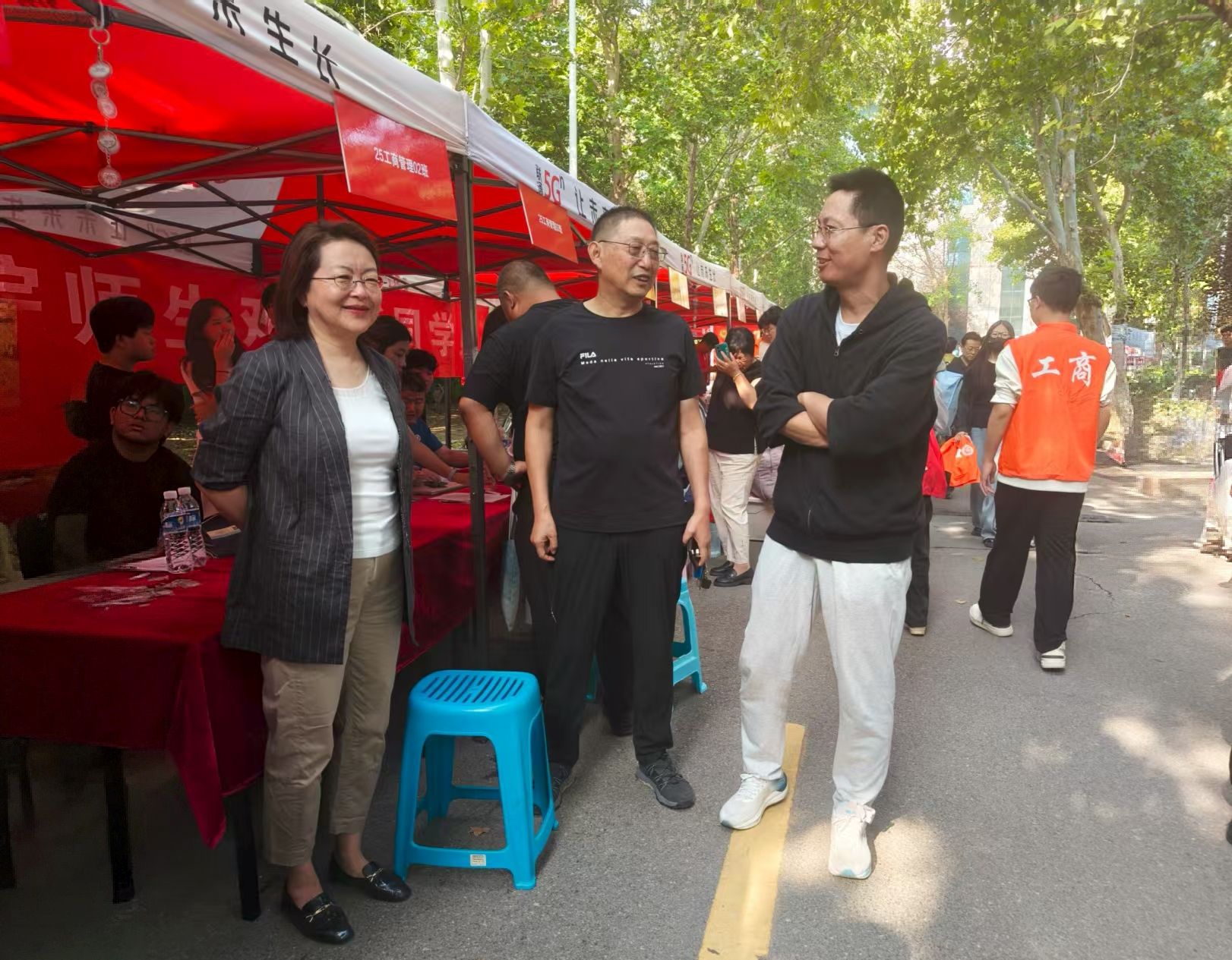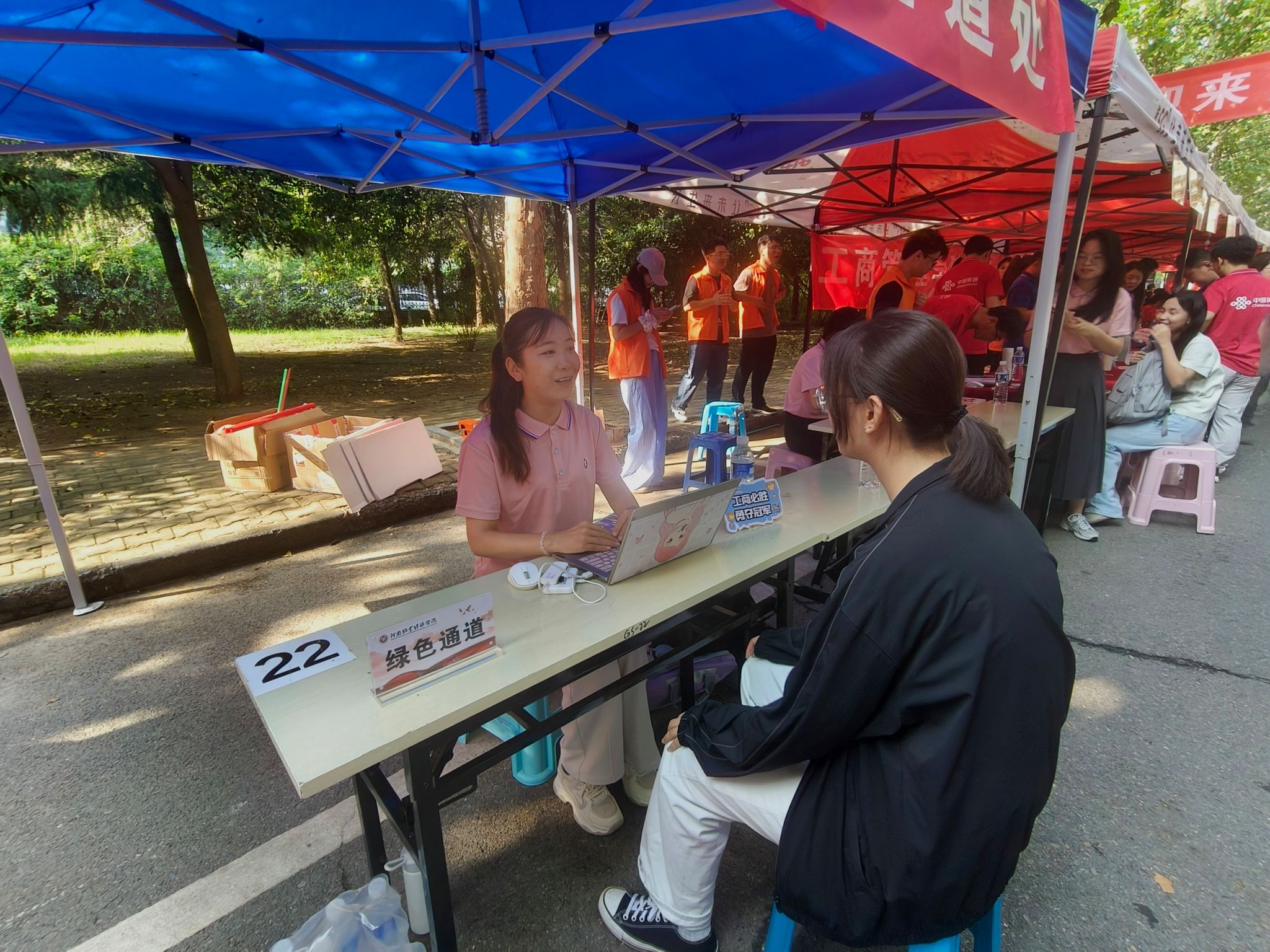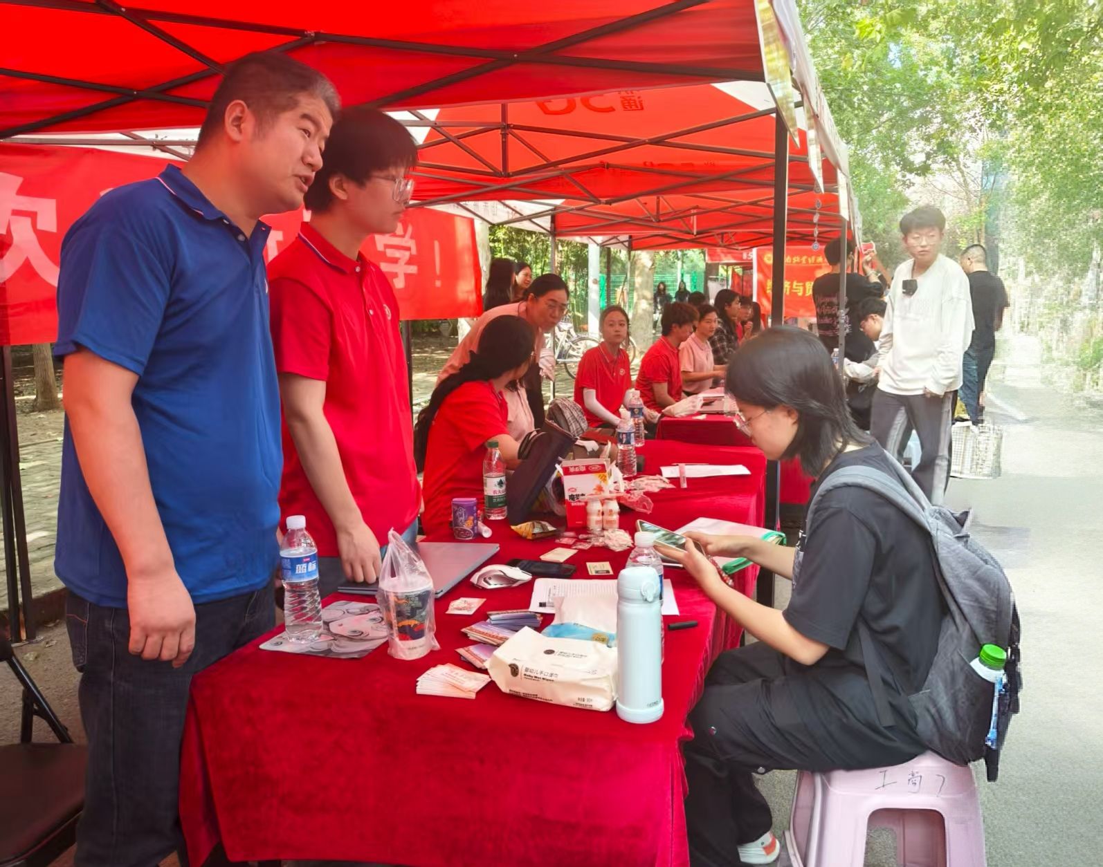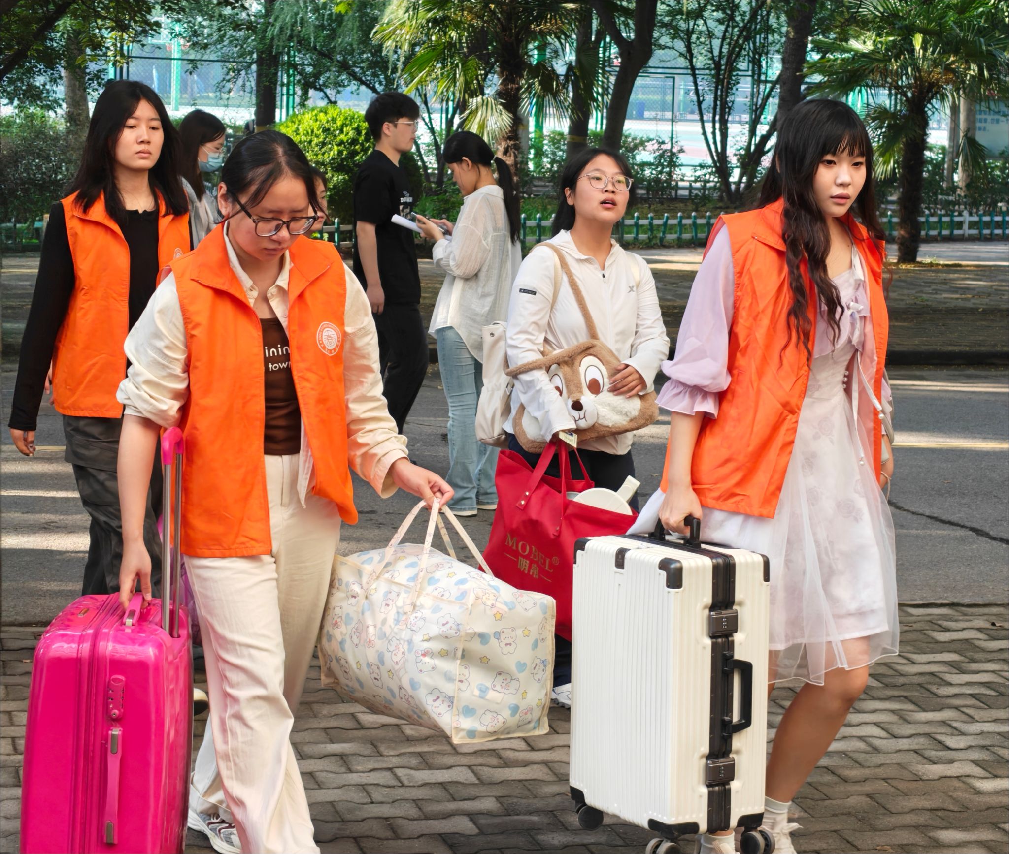 迎新现场处处洋溢着温情。志愿者们分布在校门口、林荫大道、宿舍楼、报到处等关键点位,从引导新生入校、搬运行李,到协助完成信息登记、领取物资,全程“一对一”贴心服务。报到处内,辅导员、班主任老师与新生班级助理分工明确,有序为新生办理入学手续,仔细核对报到信息,并反复叮嘱校园安全、宿舍用电等注意事项。今年,现场还特别设置了写有新生姓名的迎新展板,让新生充分感受到学院对他们到来的重视和期待