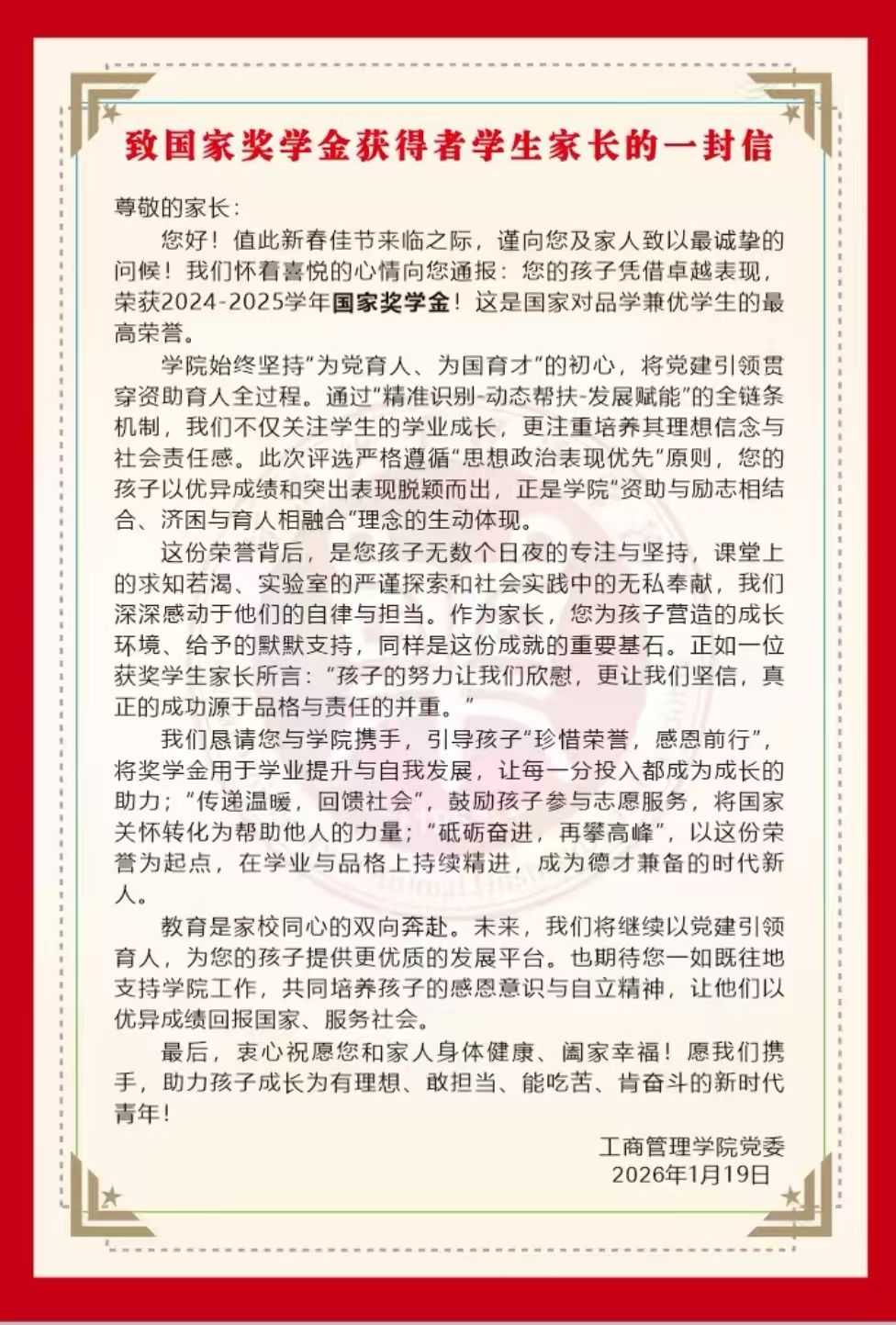 国家奖学金是高校学生荣誉体系中的最高奖项,既是对获奖学子过往勤勉笃行的充分肯定,更是对其未来成长发展的殷切期许。学院通过寄送贺信这一温情举措,将喜讯传递至千里之外,与家长共同分享学生成长成才的喜悦,让育人温度跨越山海、抵达千家万户。此举不仅生动体现了学院“资助+育人”深度融合的工作理念,也赢得了广大学生家长和社会各界的广泛赞誉。许多家长在收到贺信后,纷纷通过合影留念、微信转发、录制视频等方式晒出喜悦,真挚表达对学院用心育人的感谢与认可,“点赞”迅速刷屏朋友圈。