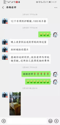 为支持学校的疫情防控工作,2019年2月17日,18营销(数据)二班的翟海利用奖学金委托老师购买了12副医学专用护目镜和1000双PE手套,合计1700元的防控物资捐赠给了校医院。面对来势汹汹的新病毒,她用自己的行动让人们看到了当代青年大学生的责任与担当。