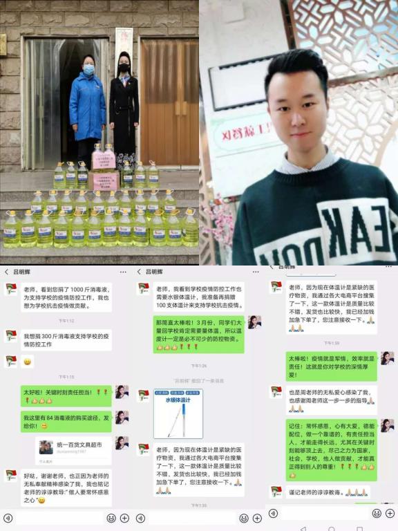作为一名预备党员,16市营一班的吕明辉,充分发挥了学生党员的模范带头作用。当看到学校领导深入一线检查指导疫情防控工作,和全校师生争相捐赠疫情防控所需物资时,他深受感染,于是向校医院捐赠100支水银体温计和300斤84消毒液,总价值2100元。为抗击疫情献出了自己的一份爱心。