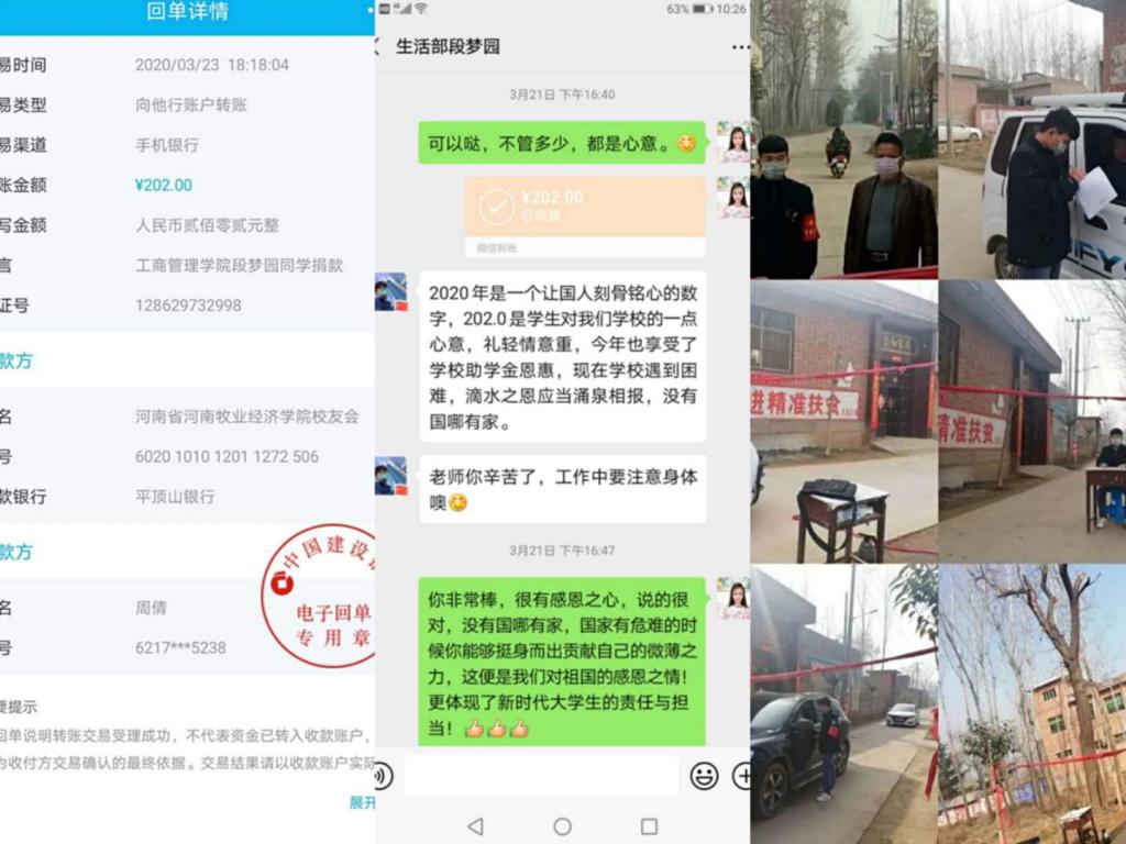 心怀感恩,共克时艰。3月22日,我院19级连锁经营管理01班的段梦园同学为学校疫情防控工作捐款202元,以表达对学校的支持与感激。段梦园同学表示:“我享受到了学校助学金的恩惠,现在学校物资短缺,滴水之恩应当涌泉相报。”此外,段梦圆同学于2月25日至今,一直坚守在其家乡的抗疫志愿服务岗位上,为家乡的基层防疫工作尽心尽力,他始终秉持着“没有国哪有家”的信念,积极行动,助力抗疫。虹为云上桥,爱是人间梯,在众志成城的坚守中,他的温暖与爱心令人动容。