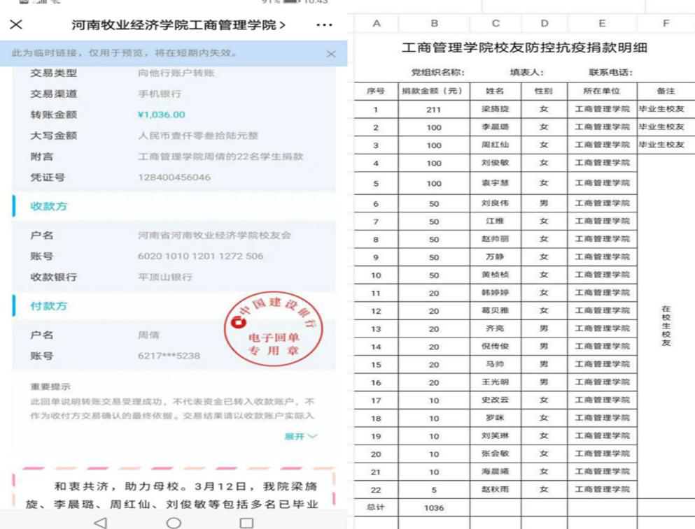 和衷共济,助力母校。3月12日,我院毕业生校友梁旖旋、李晨璐、周红仙和在校生校友刘俊敏、袁宇慧等22名同学,在得知校内防疫物资短缺后,主动请求向学校捐款,在校学子与毕业学子心系母校齐合力,一个个充满爱心与担当的红包纷纷涌入了学校爱心捐款的账号,共计1036元。“众人拾柴火焰高,相信每人都出一份力,我们一定能够打赢这场疫情防疫狙击战。”捐款学子如是说。病毒无情,人间有情,爱心捐款捐赠的不仅仅是金钱,更是我院学子们奉献母校的责任与担当!