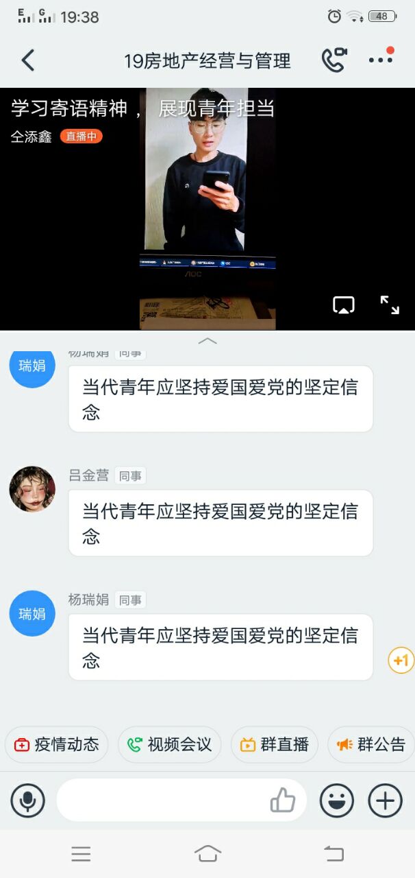活动伊始,主持人带领同学们一起学习了习近平总书记在五四之际给予青年的寄语,以及对青年工作的重要论述,希望广大团员青年传承五四精神,积极践行习近平新时代中国特色社会主义思想,牢记时代赋予的职责使命;随后,为同学们讲解了五四运动的相关历史以及五四爱国主义精神的内涵;最后,通过观看武汉医护剪辑纪录片,同学们纷纷为医护逆行者们用自己的实际行动诠释五四爱国精神的做法点赞。