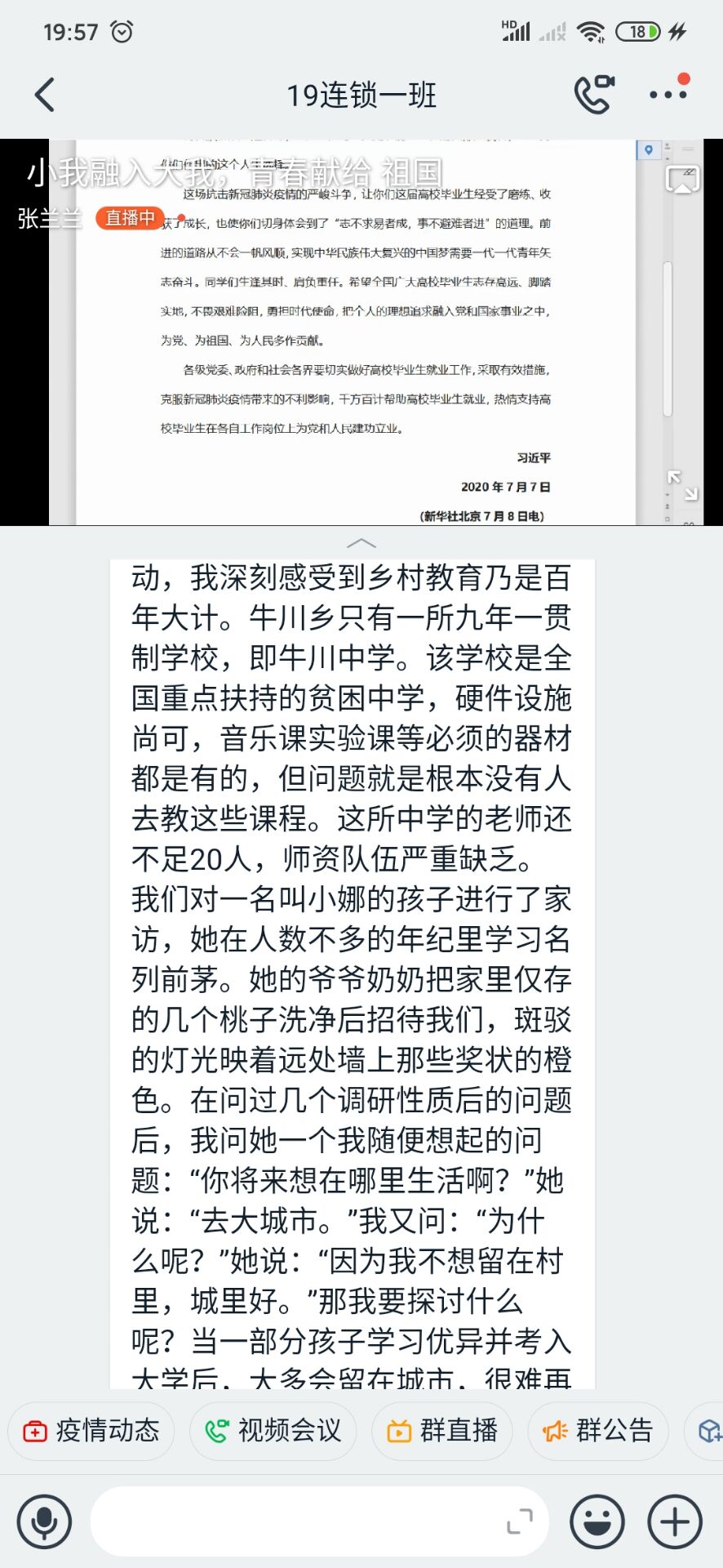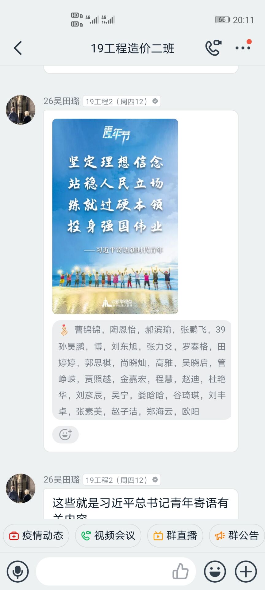 活动伊始,主持人带领同学们共同学习习近平总书记五四寄语、给北京大学援鄂医疗队全体“90后”党员回信、“习近平与大学生朋友们”系列访谈实录等;并组织同学们结合学习内容和社会实践积极发表观点;随后,主持人指出,通过深入的社会实践,团员学生更加易接受“沉浸式”精神洗礼,从内心深处打牢制度自信的根基,不断激发青春建功新时代的磅礴力量,积极投身新时代中。最后,主持人进行总结,而今中国的经济越和外面接轨,对于人才的要求就会越来越高,同学们不仅要学好学校里所学到的知识,还要不断从生活中,实践中学其他知识,不断地从各方面武装自我,才能在竞争中突出自我,表现自我。