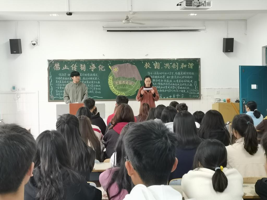 为积极响应我校普法宣传教育,提高同学们对传销的警觉意识,增强同学们辩识、防范、抵制传销的能力,营造健康和谐的校园环境。2020年11月5日15时,我院在英才校区教学楼A楼召开“禁止传销,净化校园,共创和谐”主题团课,参加团课的班级有20工商01、20工程01、20物业01、20国商02。