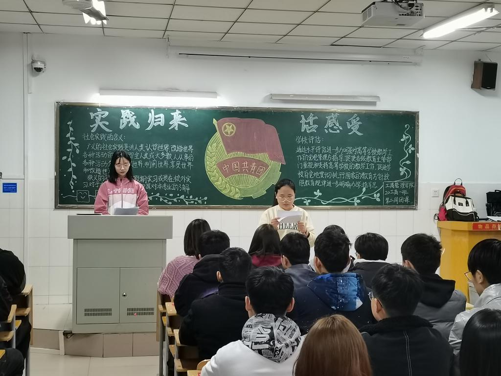 团课伊始,各团支书首先介绍了寒假社会实践活动总体情况,随后,实践队员们通过图片展示、心得分享等形式依次讲述自己的实践经历,宣传社会实践活动的成果与收获,畅谈团队组织经验、实践调研方法和个人成长收获。一张张生动、感人的照片展示了他们在寒假社会实践活动中的点点滴滴,同学们积极分享他们在社会实践活动中的种种收获以及活动后自己的内心感悟。有同学说,社会才是实践自己的大课堂,只有自己真正走进去,才会看到一些别致的风景,才体会到学校与社会的不同之处。也有同学表示,经历过社会实践后才认识到社会实践对青年大学生的重要性,社会是一个比校园更能磨练人的环境,只有学以致用,投身到社会中去才能发现自身的不足。