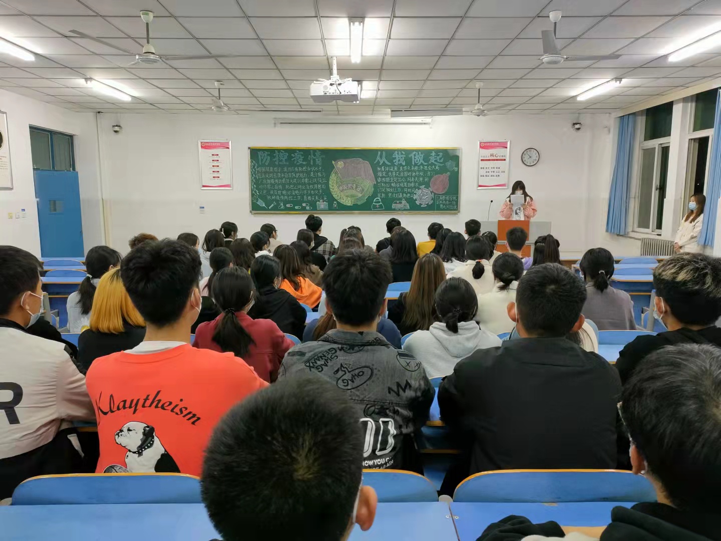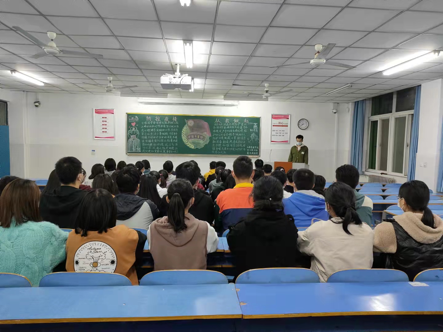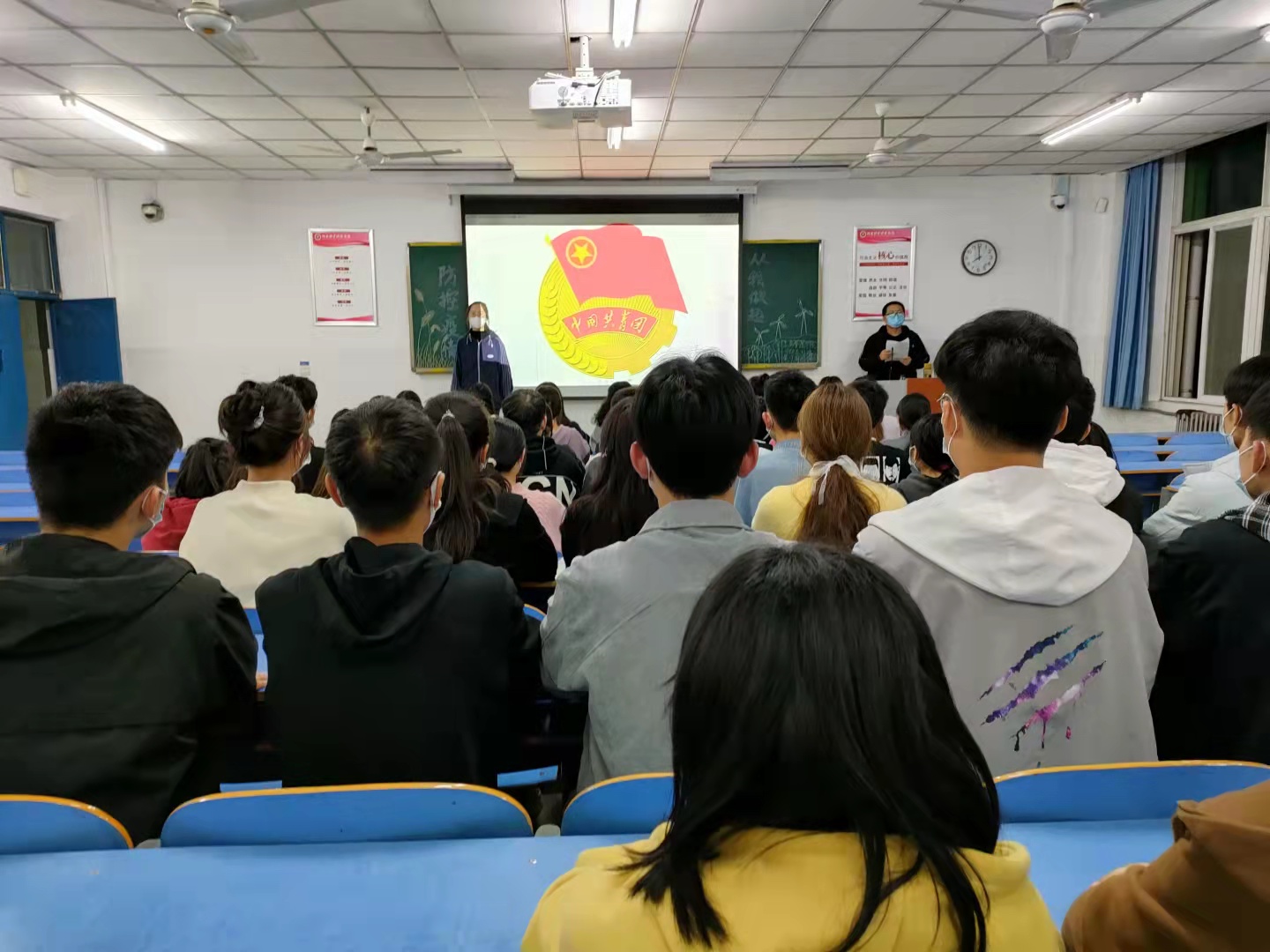 团课伊始,各班团支书概述了本次团课有关疫情防控的主要内容,同学们认真听讲,坐姿端正。其中,21国商01班的团支书为大家讲述了最近一段时间以来的疫情发展实况,让同学们对疫情发展局势有了明确的认识,也对疫情防控的重要性有了更深刻的理解。与此同时,21物业01班宣传委员向大家分享了疫情期间防控的注意事项,强化团员们对疫情防控相关知识的学习,坚定战胜疫情的信心和决心。最后,在团支书的带领下,同学们共同学习我校最新疫情防控工作要求,并督促各位同学面对疫情做到科学防范,勤洗手、多通风,提高防范意识和能力。