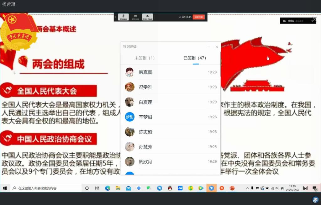 2022年3月24日晚,WilliamHill中文于线上开展“学习两会精神,凝聚奋进力量”主题团课,引导广大青年学生关注“两会”议程、学习“两会”精神,坚定理想信念,扛起使命担当。21级各专业共7个班级参与此次团课学习。