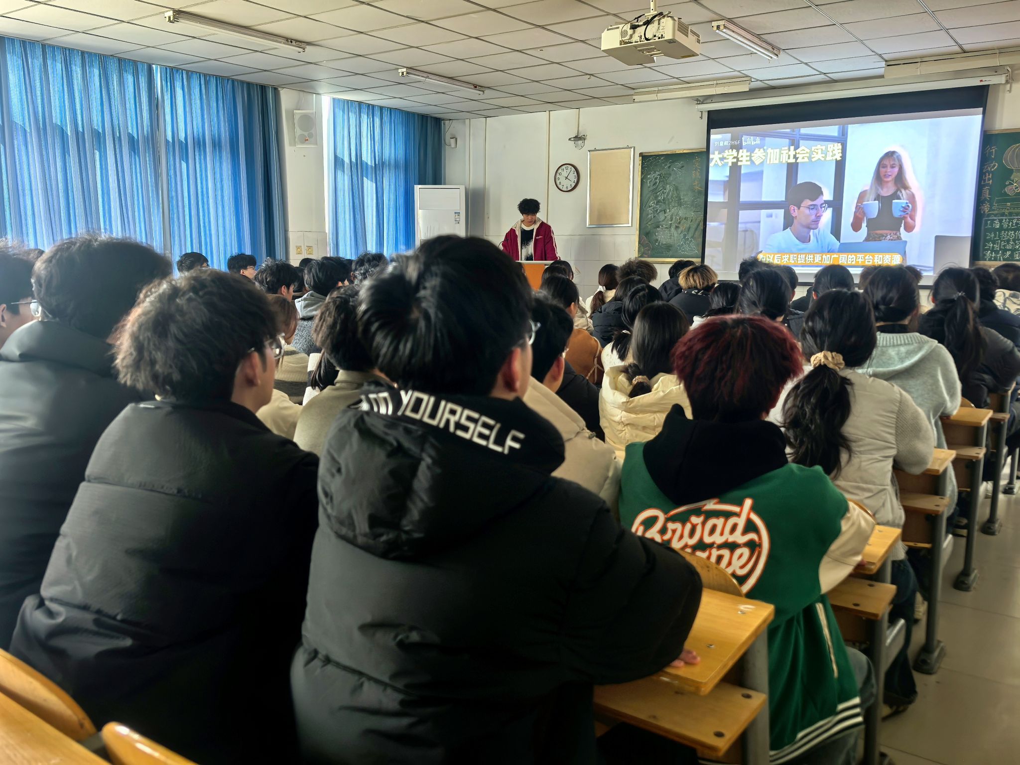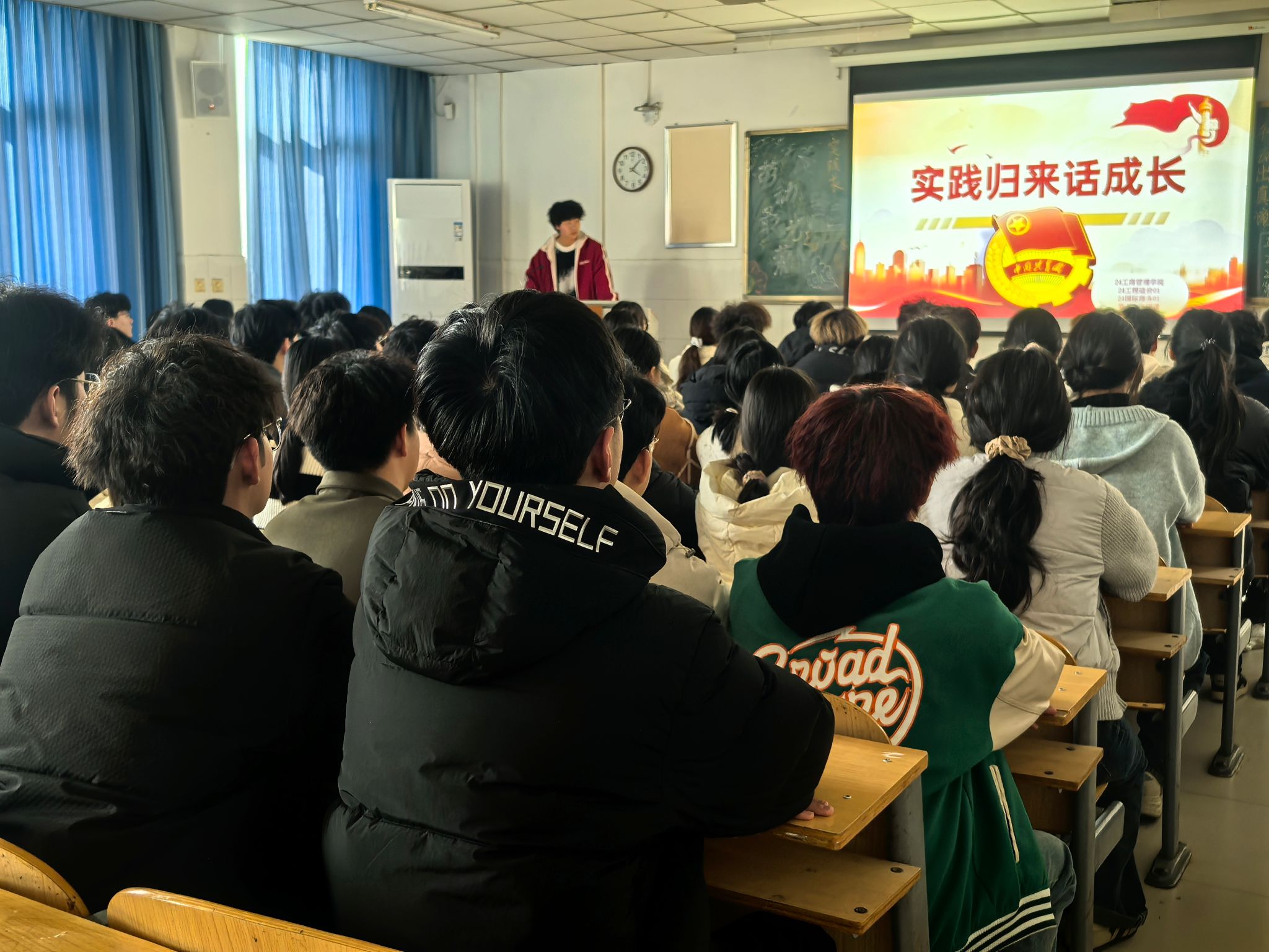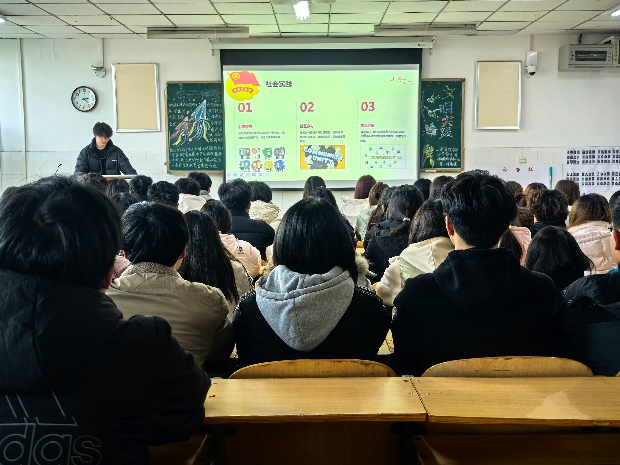 团课伊始,团支书展示了一系列关于青年学生积极参与社会实践、志愿服务的具体案例,深入阐述了承担社会责任对个人成长和社会发展的重要性,激发了同学们的热情和共鸣。随后,团支书组织同学们围绕寒假社会实践的收获与感悟进行分享。同学们踊跃发言,结合自己在社会实践中的亲身经历,讲述了从实践中获得的宝贵经验和深刻体会,如参与社区服务、助力乡村振兴的所见所闻,以及在企业实习、社会调研中的成长与收获等。通过交流心得体会,同学们不仅加深了对社会实践意义的理解,还相互借鉴了学习成长的经验。同时,同学们还就如何提升个人素质、增强社会责任感等问题进行了深入探讨。大家纷纷表示,将以此次团课为契机,进一步加强自我学习和修养,不断提升自己的综合素质和社会责任感。最后,团支书对本次团课作出总结,号召同学们牢记社会责任,积极投身社会实践,为不断提升自我、实现个人成长与社会贡献的双赢奠定基础。