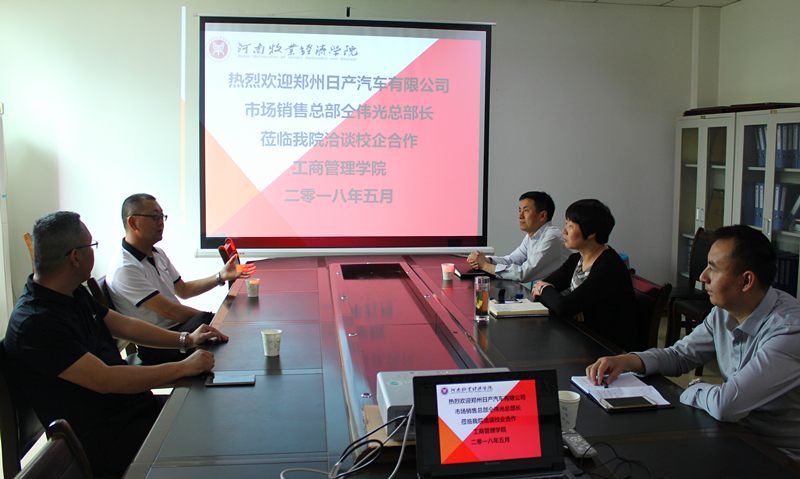 2018年5月15日,郑州日产汽车有限公司市场销售部总部长仝伟光、营销东区部长韩文凯到我校英才校区洽谈校企合作事宜。工商管理学院院长王桂朵、副院长陈先锋等与来宾进行了亲切洽谈。