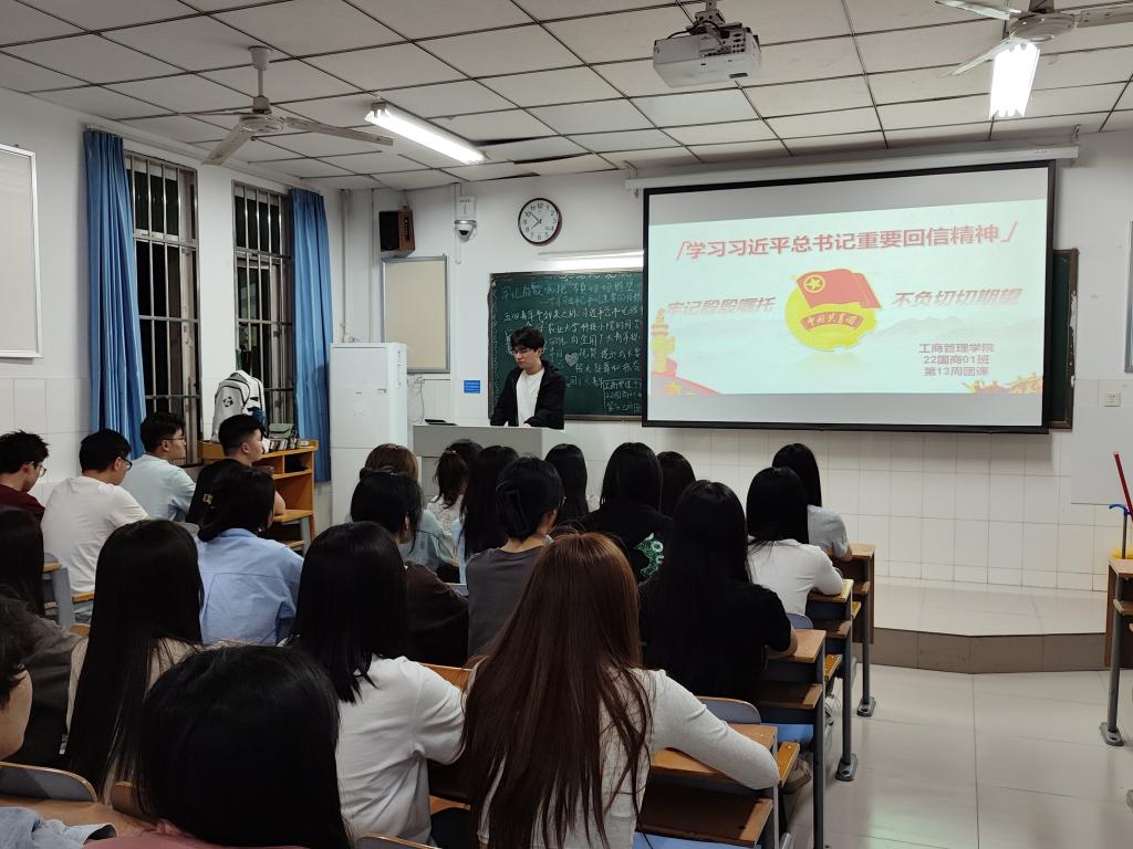 团课伊始,各班团支书带领同学们认真学习了习近平总书记给中国农业大学科技小院学生的回信内容。殷殷关怀暖人心,谆谆嘱托鼓干劲,回信原文体现了党中央对新时代青年的殷殷期望和亲切关怀,鼓舞着广大青年用实际行动践行青春使命,努力用智慧和汗水在新征程上创造新奇迹。接着,各班同学踊跃发言,22物业01班李烁同学说道:“习近平总书记的教诲如同指路明灯,照亮了我们的人生道路,我们会牢记嘱托,开拓进取、奋发有为,以深入的理论学习武装头脑,不负使命,勇担时代大任。”最后,各班团支书做出总结,并鼓励同学们牢记习近平总书记的谆谆嘱托,志存高远、脚踏实地,自觉将“小我”正青春融入“大我”新时代,始终把个人理想融入国家和民族的事业中,不负党和国家的期望。