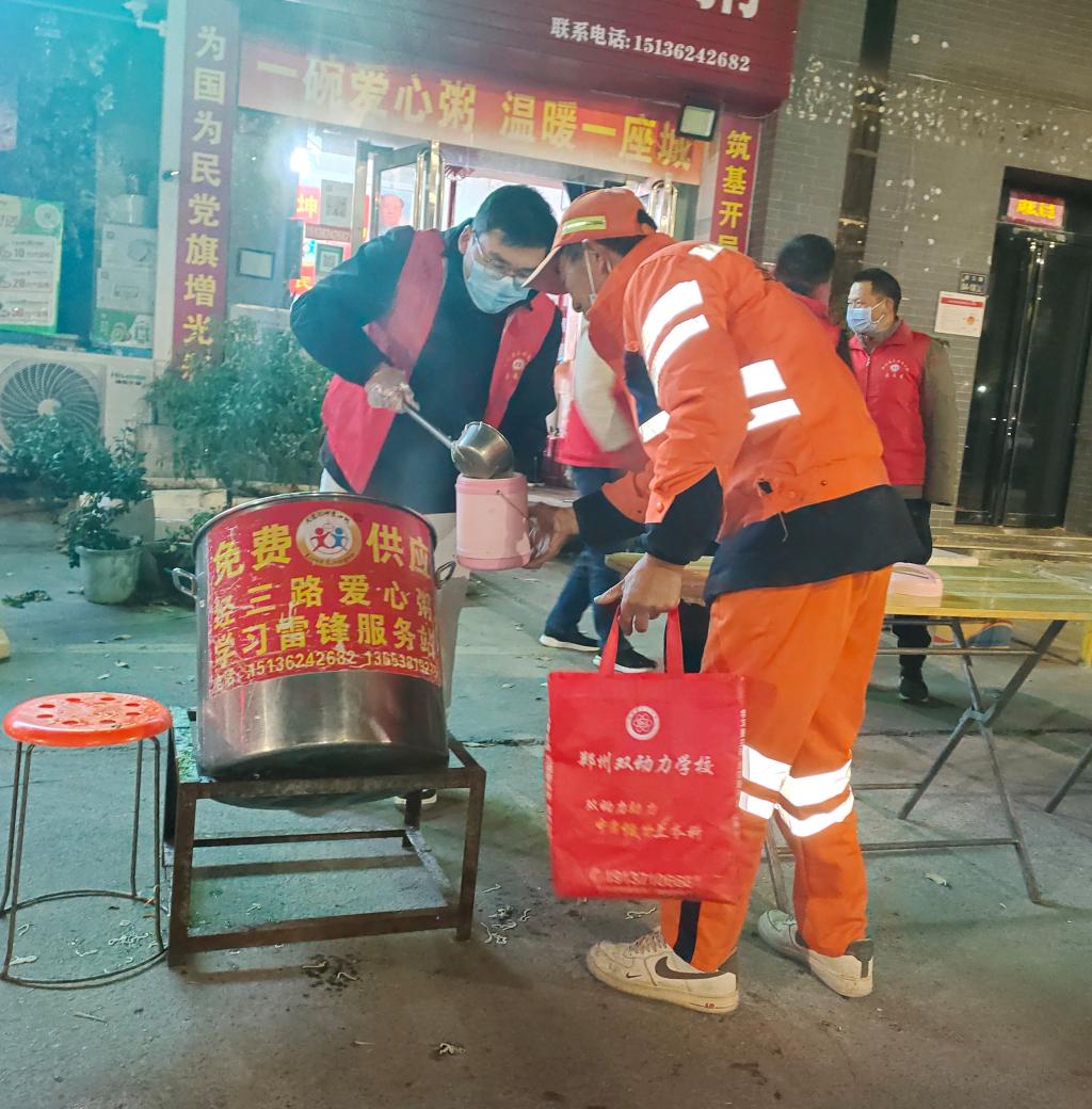 随后粥屋工作人员和志愿者们一起合唱:《东方红》和《学习雷锋》两首歌,由志愿者带头进行志愿宣誓。准备工作完毕后,志愿者们开始分发馒头,盛舀饭菜,记录每一个来打饭的孤寡老人和环卫工人的名字,并向他们致以热情的问候;“谢谢你们”是他们朴素的答复,彼此的沟通,让大家的心贴的更近、情变得更暖。