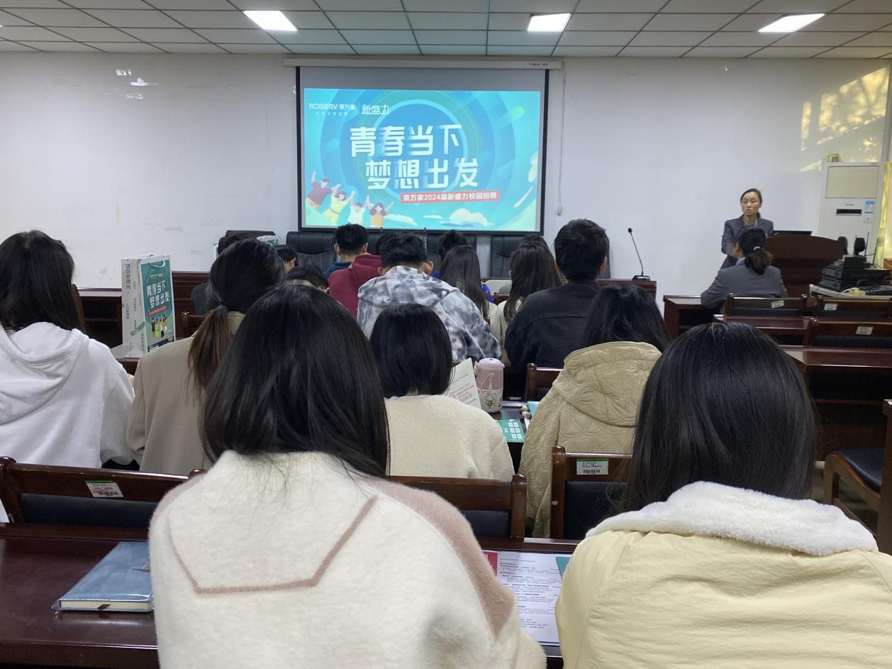 宣讲会上,负责人李雪艳经理通过放映公司宣传片和讲解ppt的方式向同学们详细介绍了企业的基本情况,内容涵盖企业发展概况、招聘岗位、薪酬待遇、晋升渠道等。李经理的热情讲解让同学们直观感受到了企业的整体概况,对进入企业后的发展和前景有了初步的认知和了解。在答疑解惑环节,同学们积极和企业负责人互动交流,现场气氛热烈。