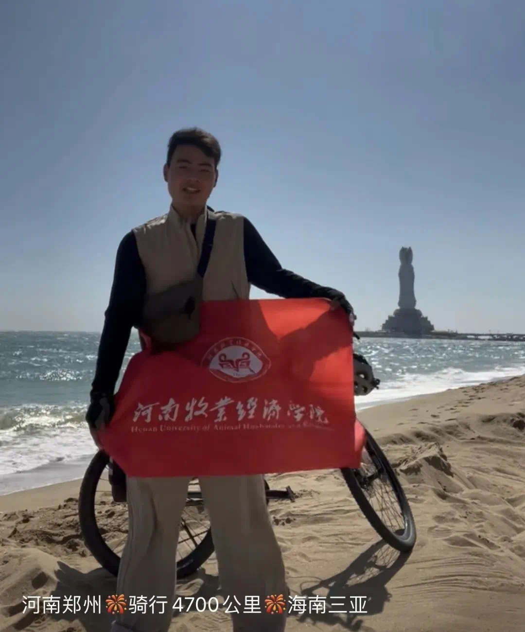 经过数天的骑行,黄士辉同学终于到达了目的地三亚。他带着校旗在海边拍照留念,表达了自己对祖国的热爱和对青春的热血。黄士辉同学的这次骑行活动不久便受到社会广泛关注,河南日报、河南省教育厅、郑州晚报、搜狐网、惠济发布等多家媒体相继报道。他的行动激励着更多的人去追求自己的梦想,并用自己的方式为祖国献出一份力量。