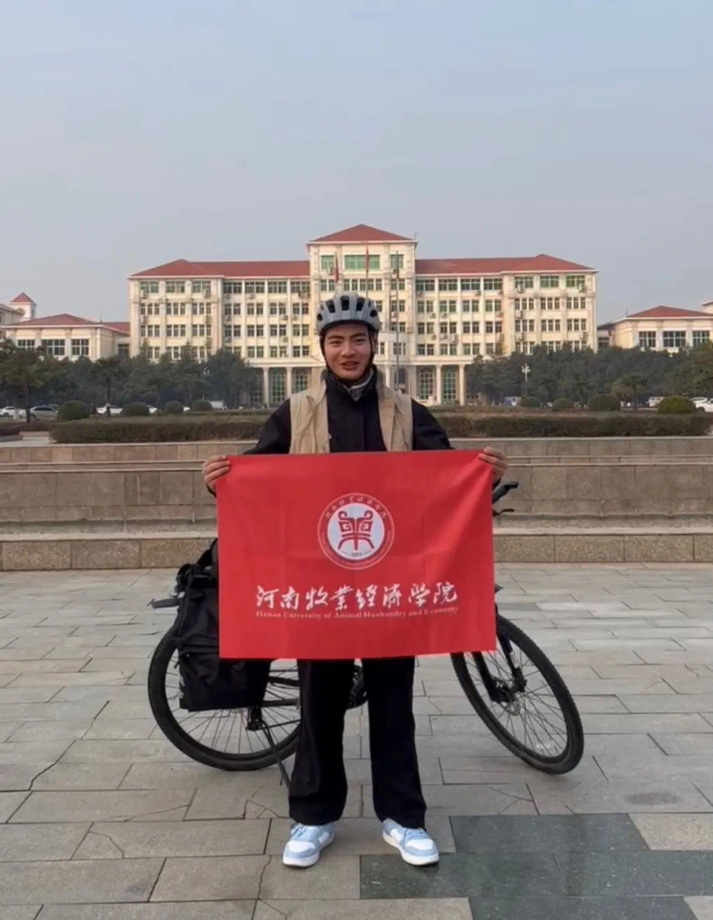 黄士辉同学在校期间成绩优异、自立自强,此次骑行费用皆来自奖学金和兼职所获得的收入。他希望这次骑行活动能够通过自己的努力和坚持,向更多人传递积极向上的精神风貌。出发前,黄士辉同学进行充分的计划,他准备了骑行所需的装备和食品,也准备了校旗和宣传册,以便沿途向人们介绍他的目的和信念。在骑行过程中,黄士辉同学经历了种种困难和挑战,但他始终坚持着。他说:“虽然路途遥远,道路艰辛,但每当我看到校旗在风中飘扬,我就感到无比的自豪和动力。”一路上,黄士辉同学结识了同样有理想的好友,遇到了环游世界的退休大叔、埃塞俄比亚的流浪画家、77岁骑行环游中国的大爷、骑行1000多公里回家过年的骑友、得知他是从郑州骑行来坚持不收取费用的补货包裁缝阿姨以及赠送哈密瓜的海南果农大叔等,许多人都主动与他交流,询问他的目的和经历,并对他的勇敢和坚持表示敬佩。