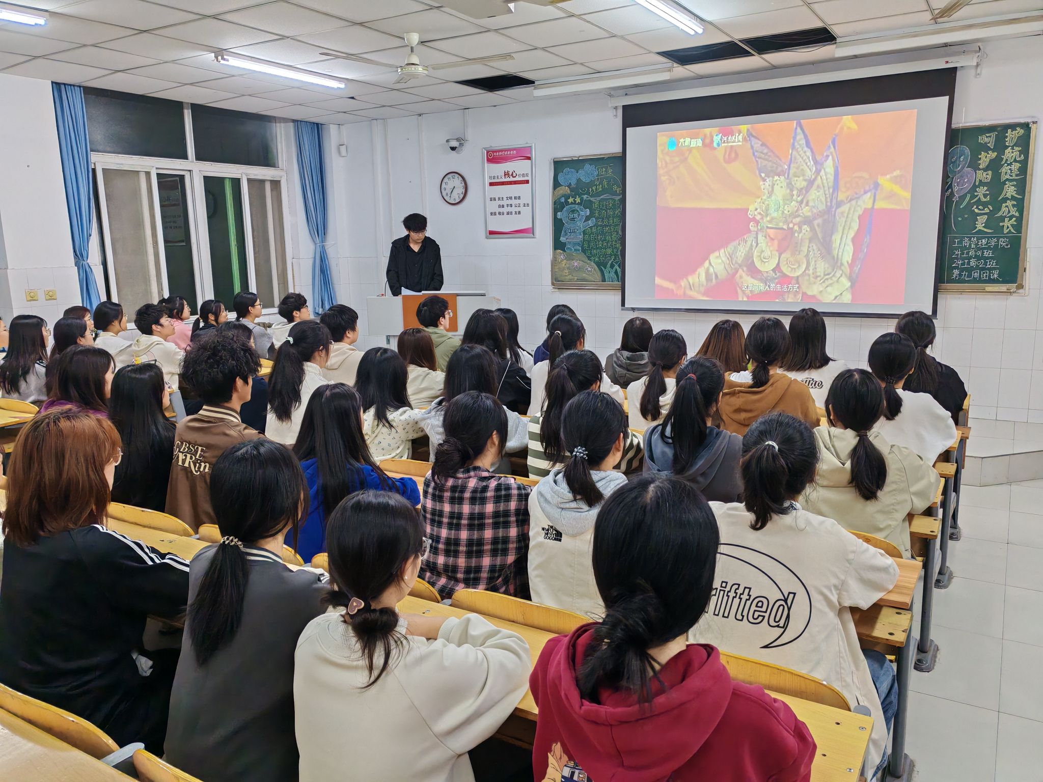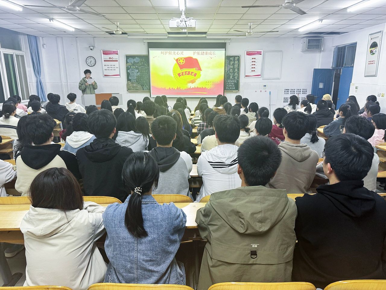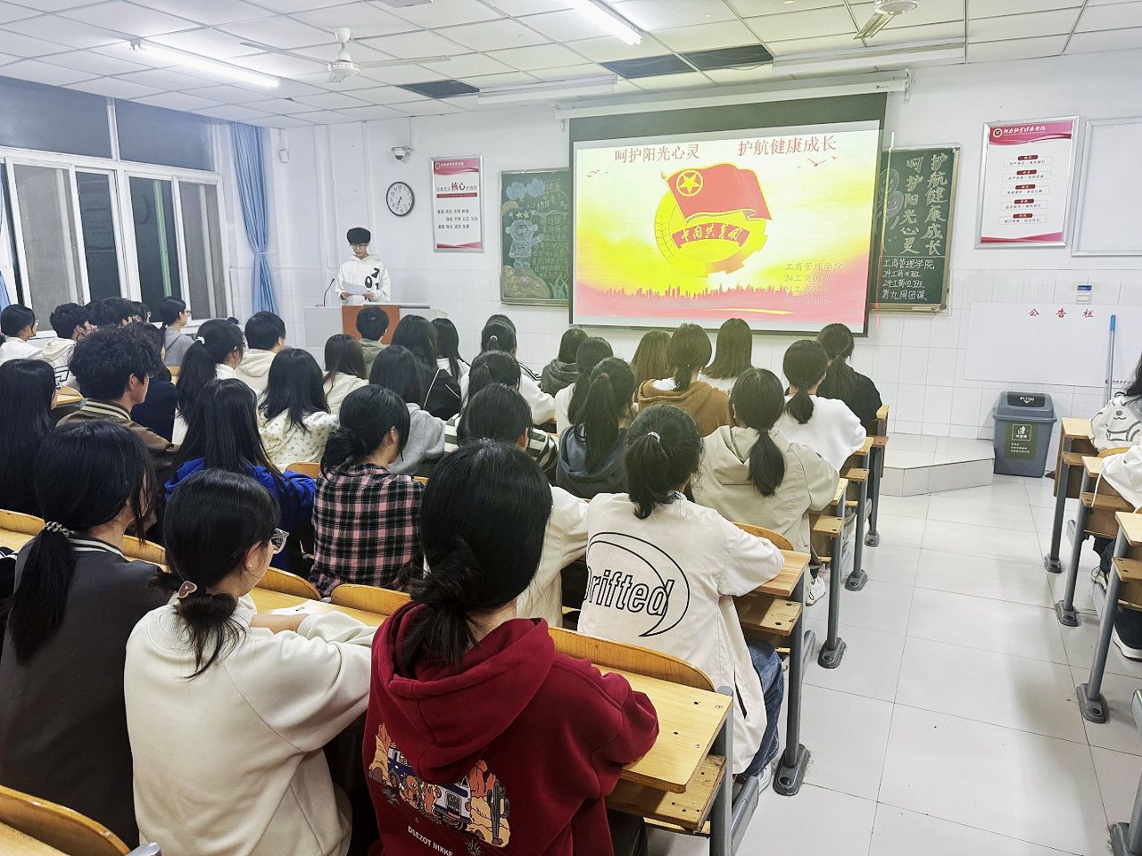 团课伊始,各班团支书通过播放心理健康宣传片、展示学生心理健康问题的典型案例、解读相关政策文件等形式,向同学们深入阐述了心理健康的重要性。他们鼓励同学们要正视心理健康问题,不断提升自身心理健康素养和自助、求助的能力。接着,团课进入互动环节,团支书带领同学们分组进行讨论。大家分享了自己对心理健康的理解和认识,以及在遇到心理困扰时如何寻求帮助和进行自我调节的经验。同学们积极发言,就生活方式、情绪管理、社交互动、自我成长等方面提出了许多富有创意和可行的建议,如建立心理健康互助小组、开展心理健康主题活动等。最后,团支书对本次团课作出总结,号召大家积极关注和维护自己的心理健康,将心理健康意识内化于心、外化于行,以实际行动为自身和周围同学的心理健康贡献力量。