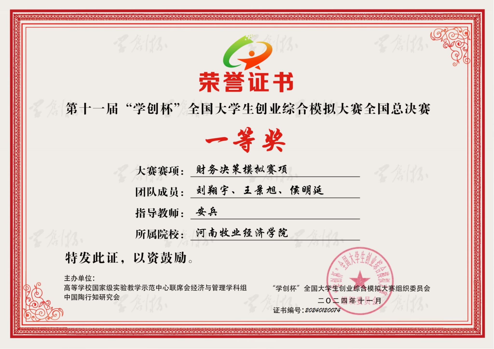 2024年11月3日,在第十一届“学创杯”全国大学生创业综合模拟大赛全国总决赛上,我校代表队发挥出色,获得本科组全国一等奖。