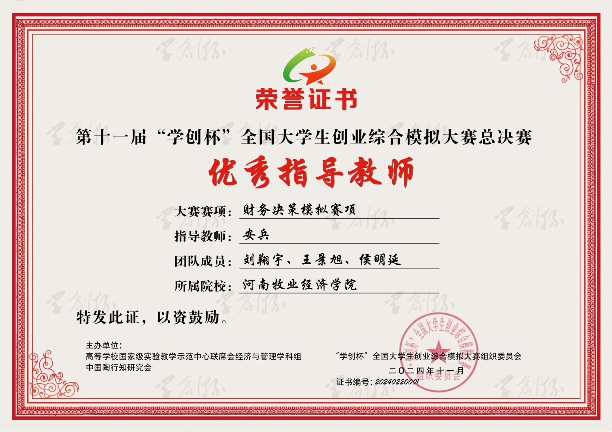 本次大赛由高等学校国家级实验教学示范中心联席会经济与管理学科组、中国陶行知研究会主办,徐州医科大学承办。本届“学创杯”创业综合模拟大赛全国总决赛,吸引来自全国172所高校242支本科参赛队伍同台竞技。各参赛团队经过激烈角逐,我校刘翔宇、王景旭、侯明延同学组成的凌云队,在WilliamHill中文安兵老师的带领下,不畏强手,与多所双一流高校展开比拼,获得“财务决策模拟”赛项一等奖,安兵老师获得“优秀指导教师奖”。