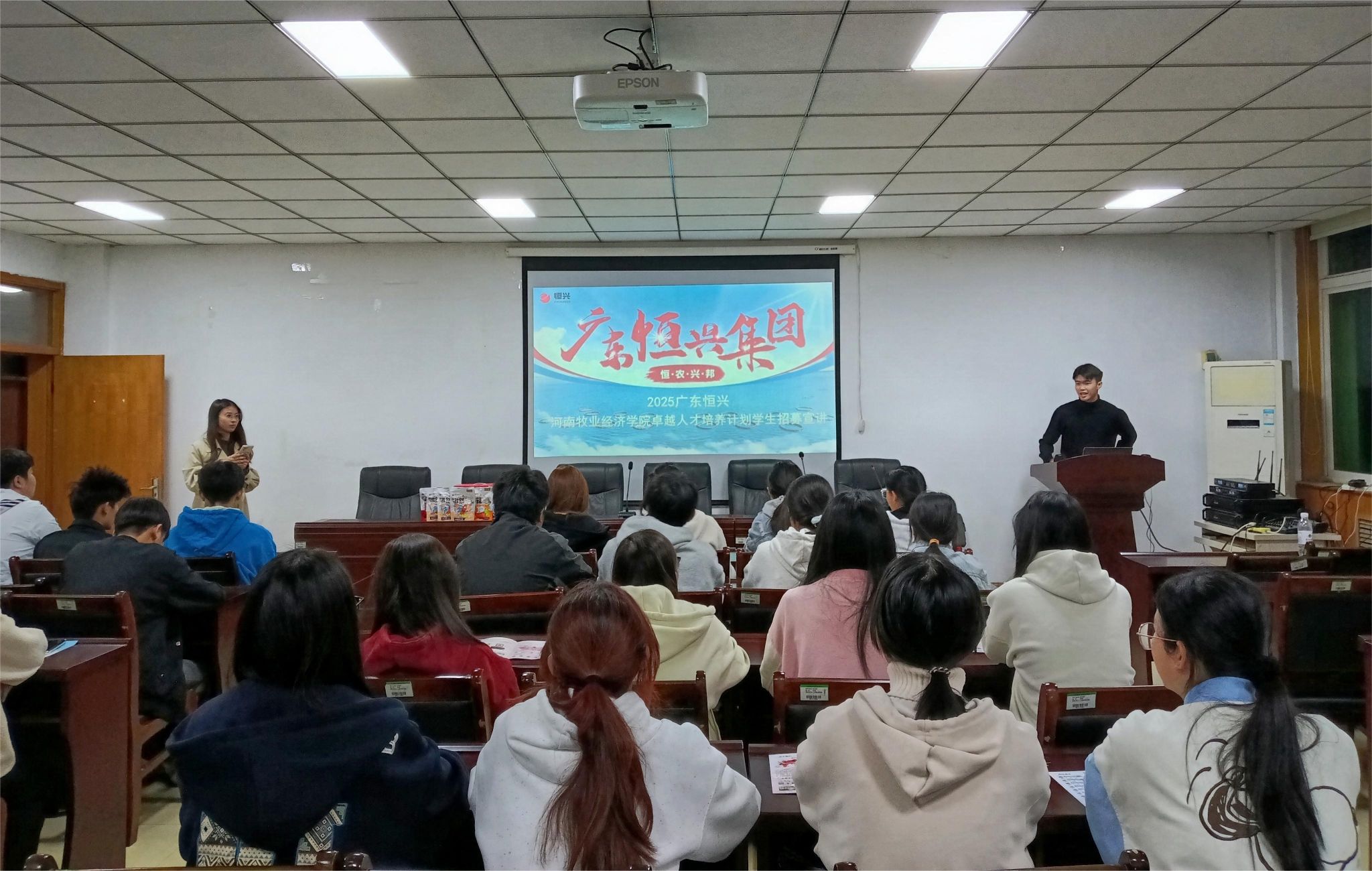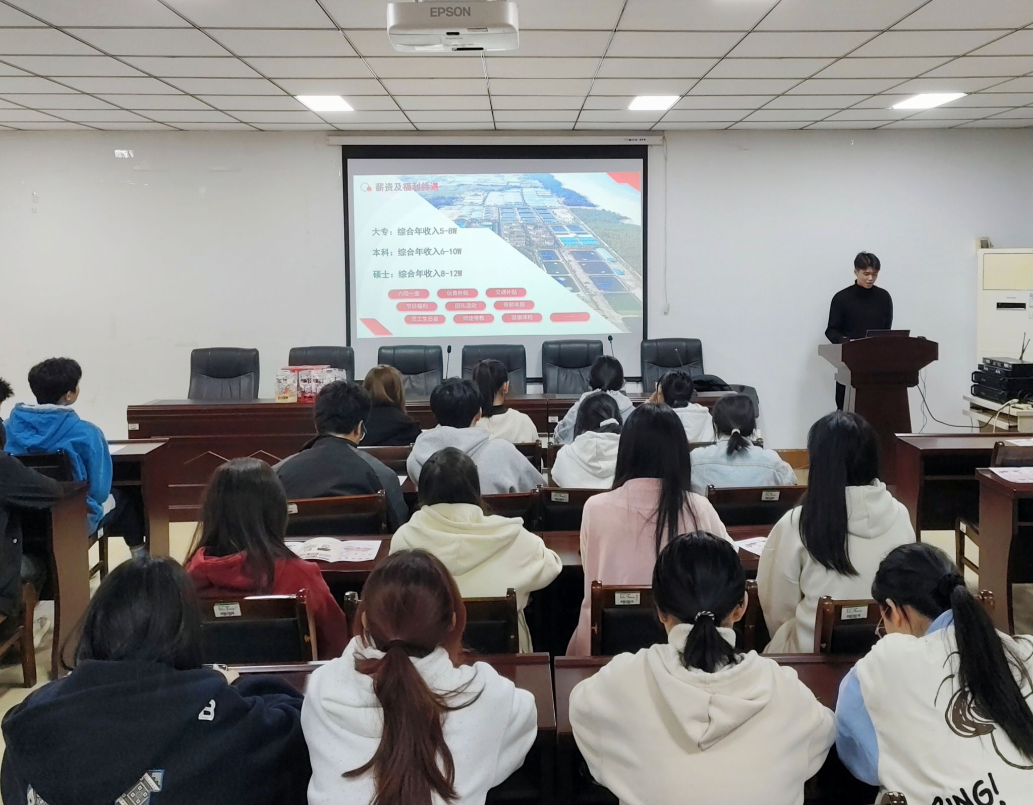 宣讲会上广东恒兴集团有限公司的人事专员黄嘉辉向学生们介绍了公司的辉煌历程与发展成就。他详细介绍了业务板块,如种苗繁育、饲料产销、智慧渔业等,强调公司始终秉持“恒农兴邦”的使命,为提高人类生活品质和多元化发展努力。接着,企业代表通过播放公司宣传片等形式,向学生们展示了恒兴集团在生产、研发、销售等各个环节的先进理念与公司的“双轨制”职业发展路径,进一步增强了学生们对恒兴集团的了解和认同。最后,宣讲会进入互动环节,学生们就职业发展、薪资待遇、工作环境等方面提出疑问,人事主管陈恩彤一一回答,并进行了专业的就业指导。学生们纷纷表示此次宣讲会不仅让他们对恒兴集团的企业文化、业务领域、发展前景等有了更加全面的了解,还对自己未来就业充满了信心与期待。据不完全统计,有60多名同学递交了求职申请,部分同学加了企业求职群。