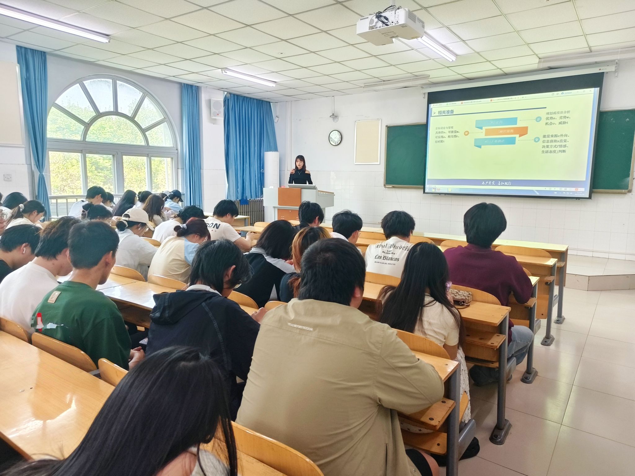 随后,在经验分享环节,张梦滑同学结合自身备赛及获奖经历,围绕职业规划书撰写、PPT制作、现场答辩等核心环节进行系统讲解。她强调,优质职业规划书需兼具明确目标、严谨逻辑与详实数据支撑,同时注重个人特色与职业定位的深度融合。分享过程中,张梦滑通过展示获奖作品,对职业分析、目标设定、实施路径等重点模块进行深入解析,并针对参赛常见问题提出具体应对策略。在互动交流环节,她耐心解答同学们关于赛事准备、职业定位等方面的疑问,现场氛围热烈。分享尾声,张梦滑深情回顾学校在备赛过程中给予的专业指导与资源支持,号召同学们依托学院平台优势,以饱满热情投身职业规划实践。