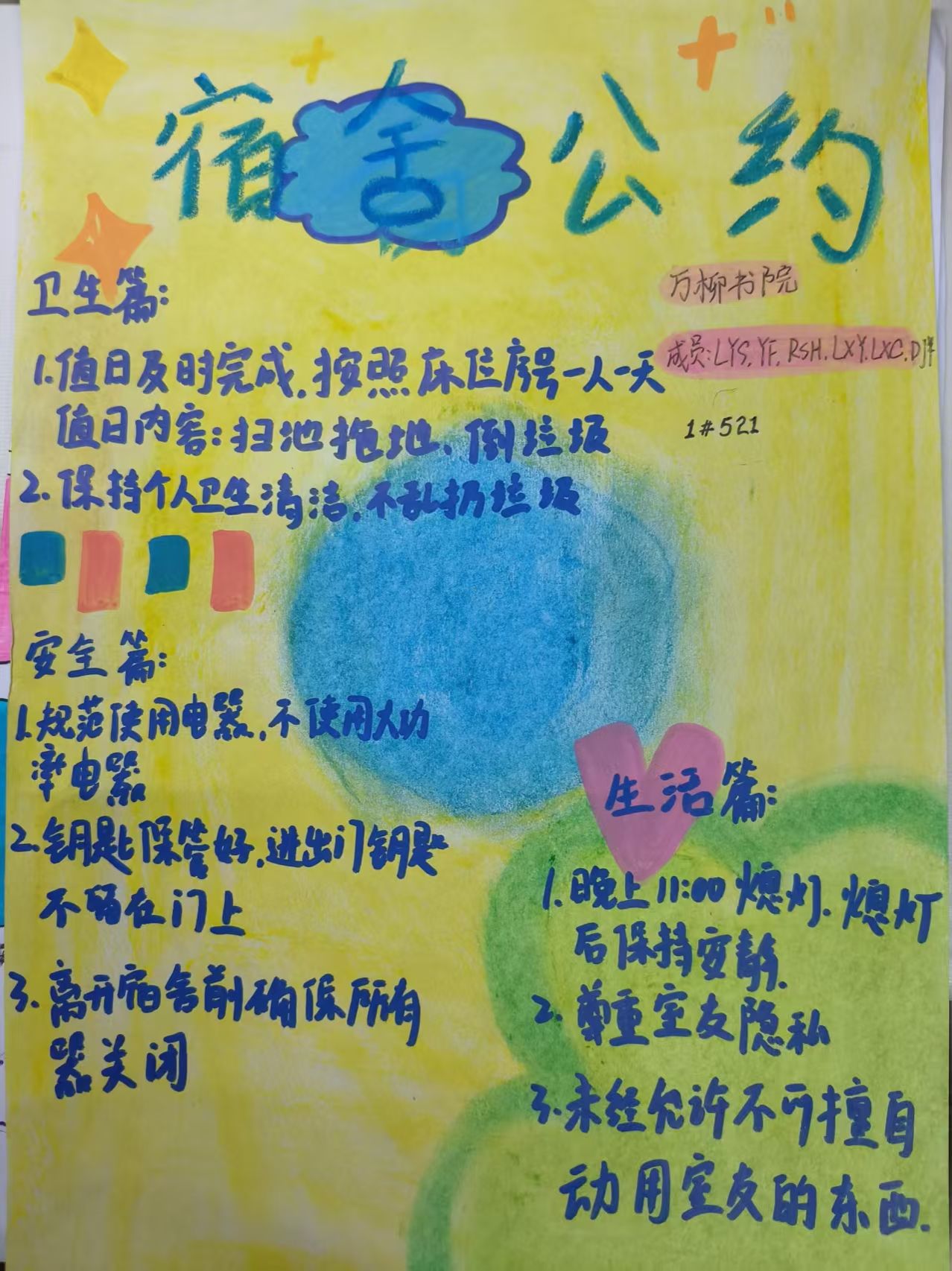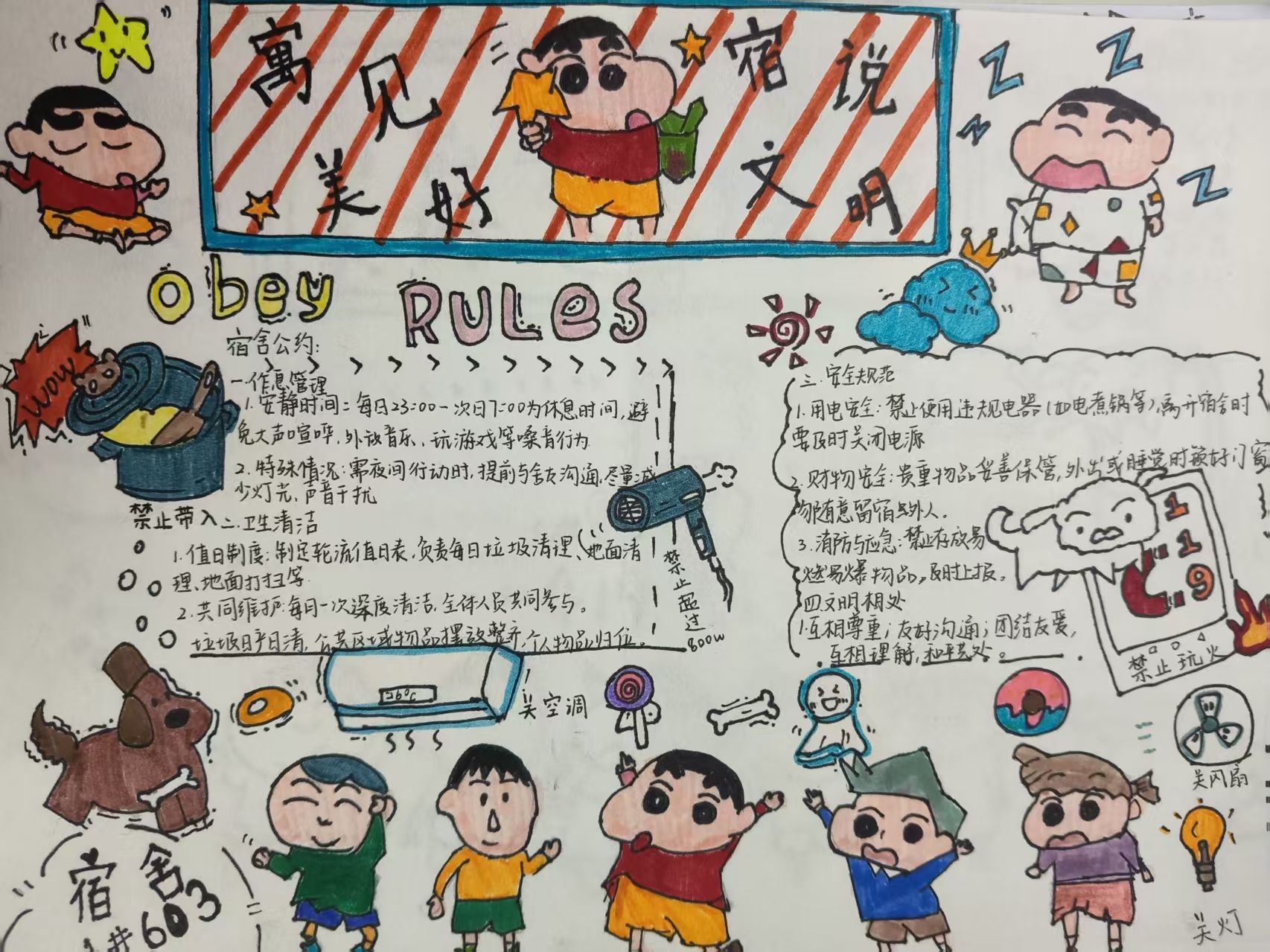 活动期间,各宿舍围绕文明、安全、和谐等主题,通过文字撰写与艺术创作双轨并行的方式,将公约内容具象化呈现。文字类作品逻辑清晰、条理分明,系统阐释宿舍管理规范;绘画类作品则以灵动笔触勾勒文明图景,展现出青年学子丰富的想象力。各宿舍长充分发挥“头雁效应”,组织成员深入研讨,通过民主协商、意见征集,形成贴合实际、操作性强的公约条款,确保制度既体现集体意志,又兼顾个体差异。经评选,多份优秀作品脱颖而出。这些凝结集体智慧的宿舍公约,不仅成为规范日常行为的"说明书",更化作维系舍友情谊的"连心桥",有效化解潜在矛盾,推动形成互相尊重、团结友爱的宿舍氛围。